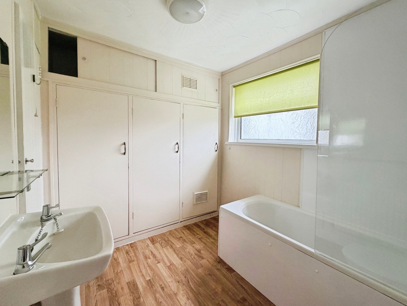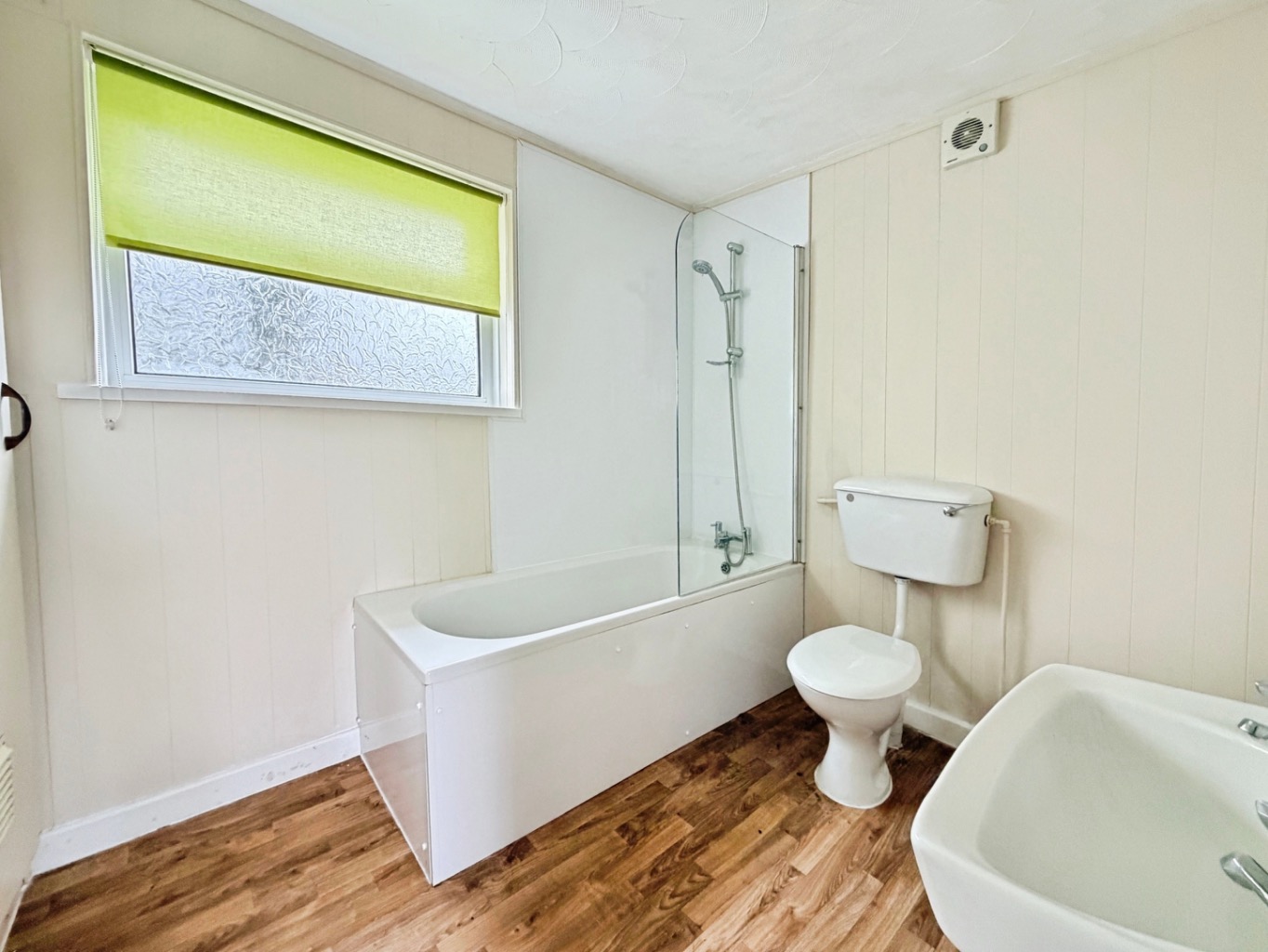 Fitted with a white three piece suit comprising of W/C, sink, bath with shower over and a glass modesty screen, boiler located inside built in storage, uPVC window to front elevation.