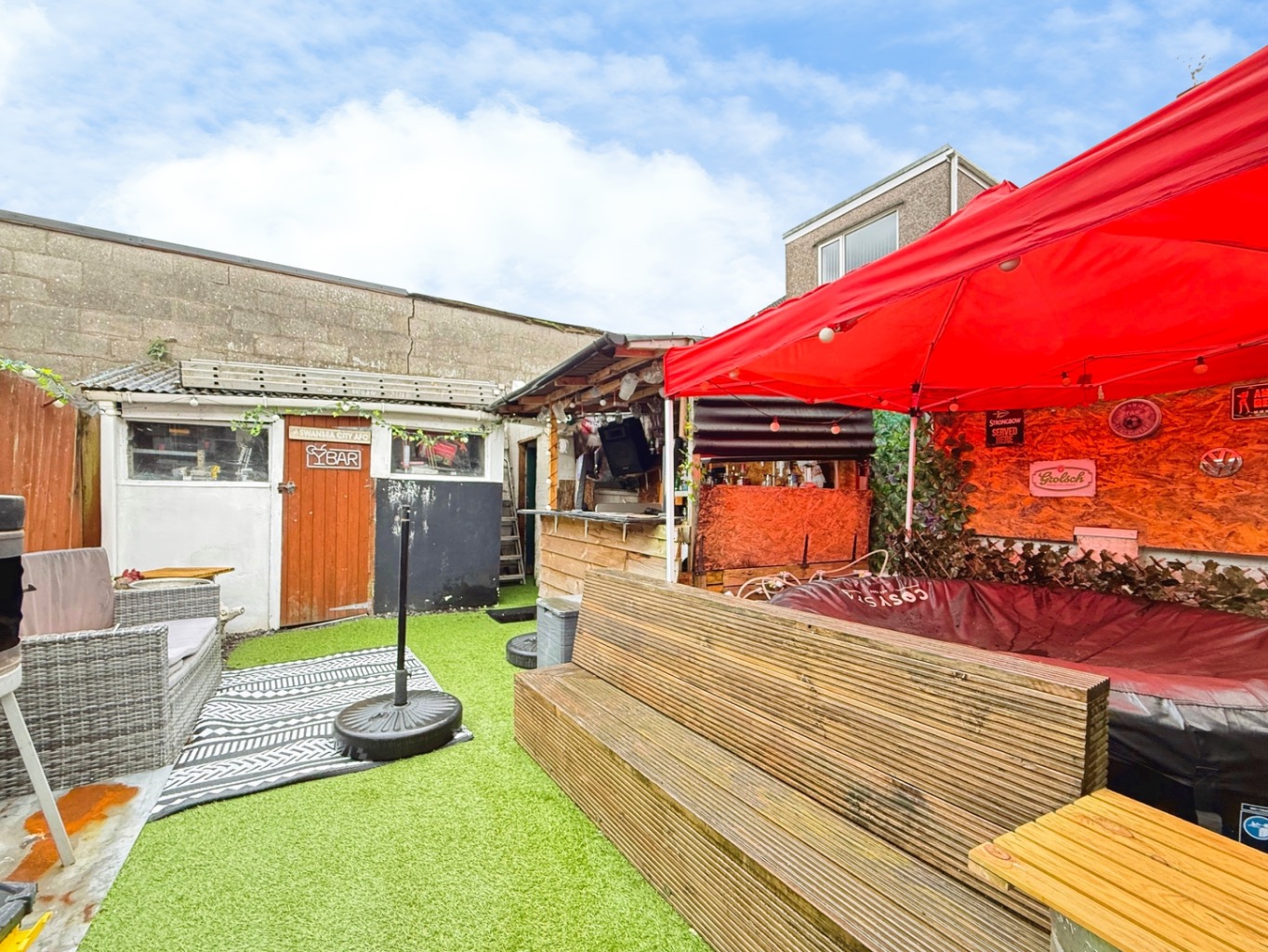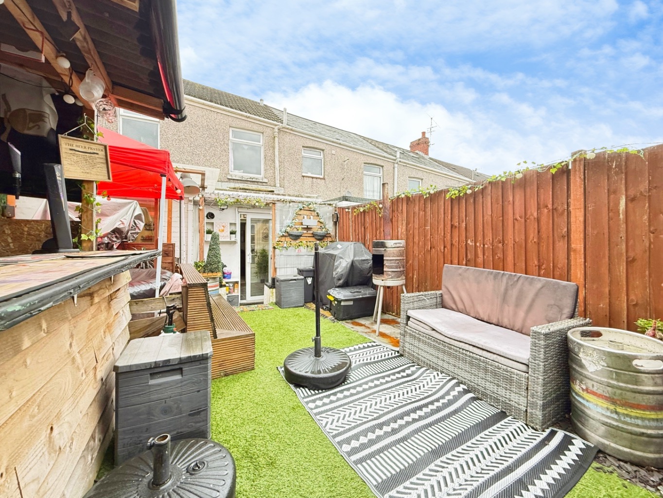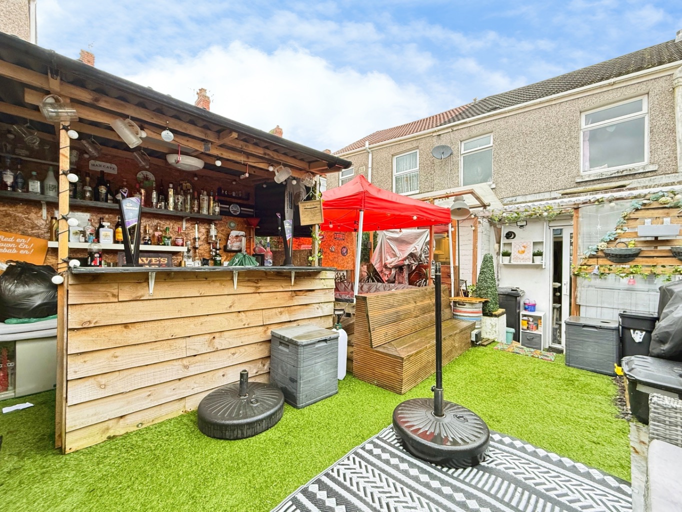 To the rear of the property there is a low maintenance fully enclosed rear garden mainly laid to artificial lawn, outbuilding utilised as home bar, shed & outside toilet.