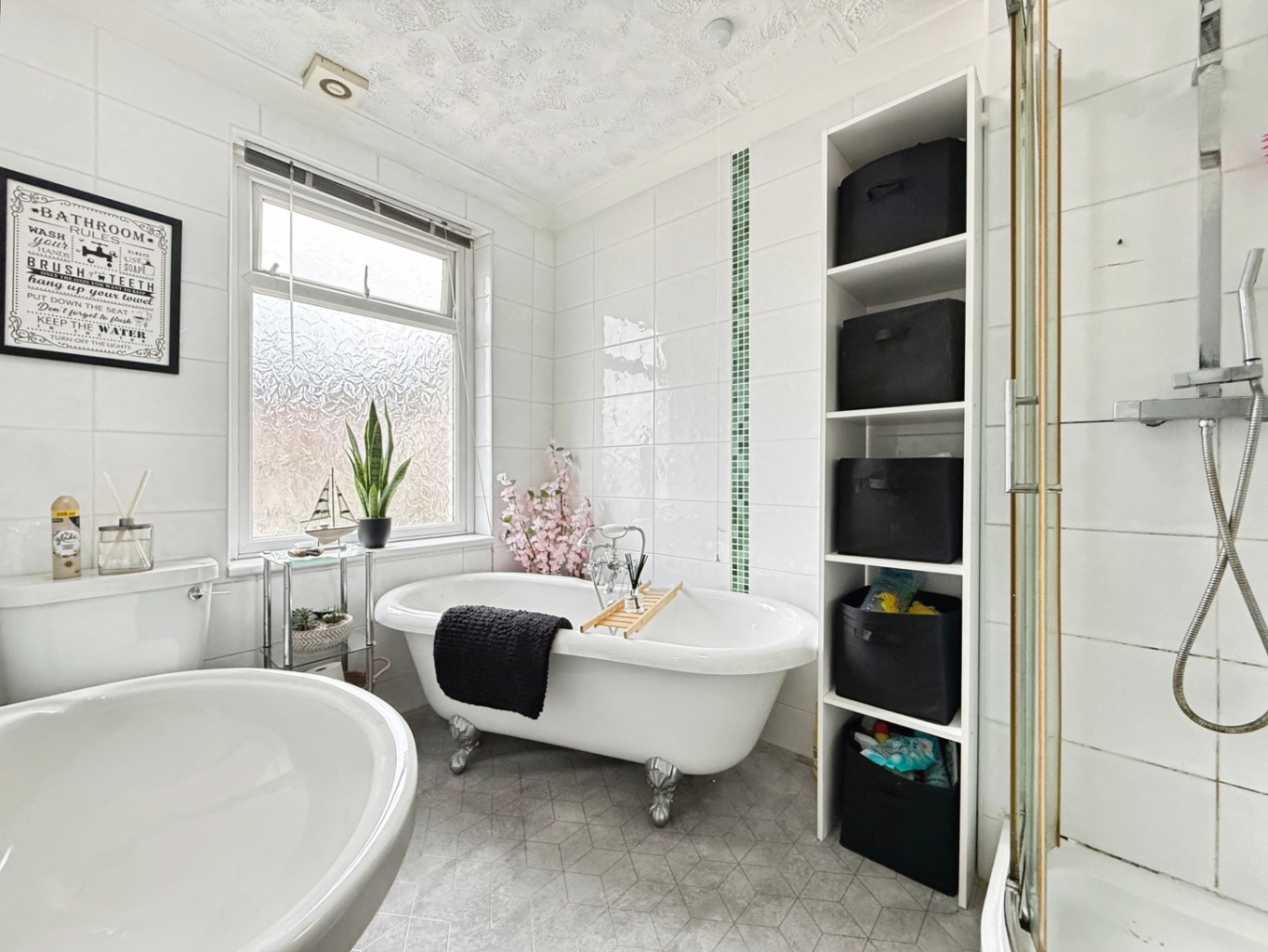 Upstairs, the property benefits from two well-proportioned bedrooms and a four-piece family bathroom, complete with a freestanding bath and separate shower, creating a stylish and practical space.