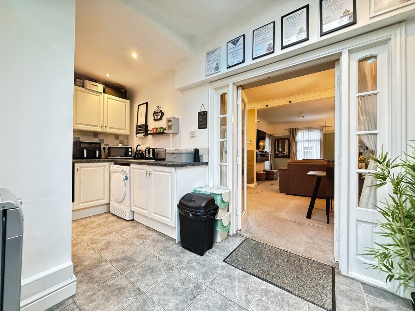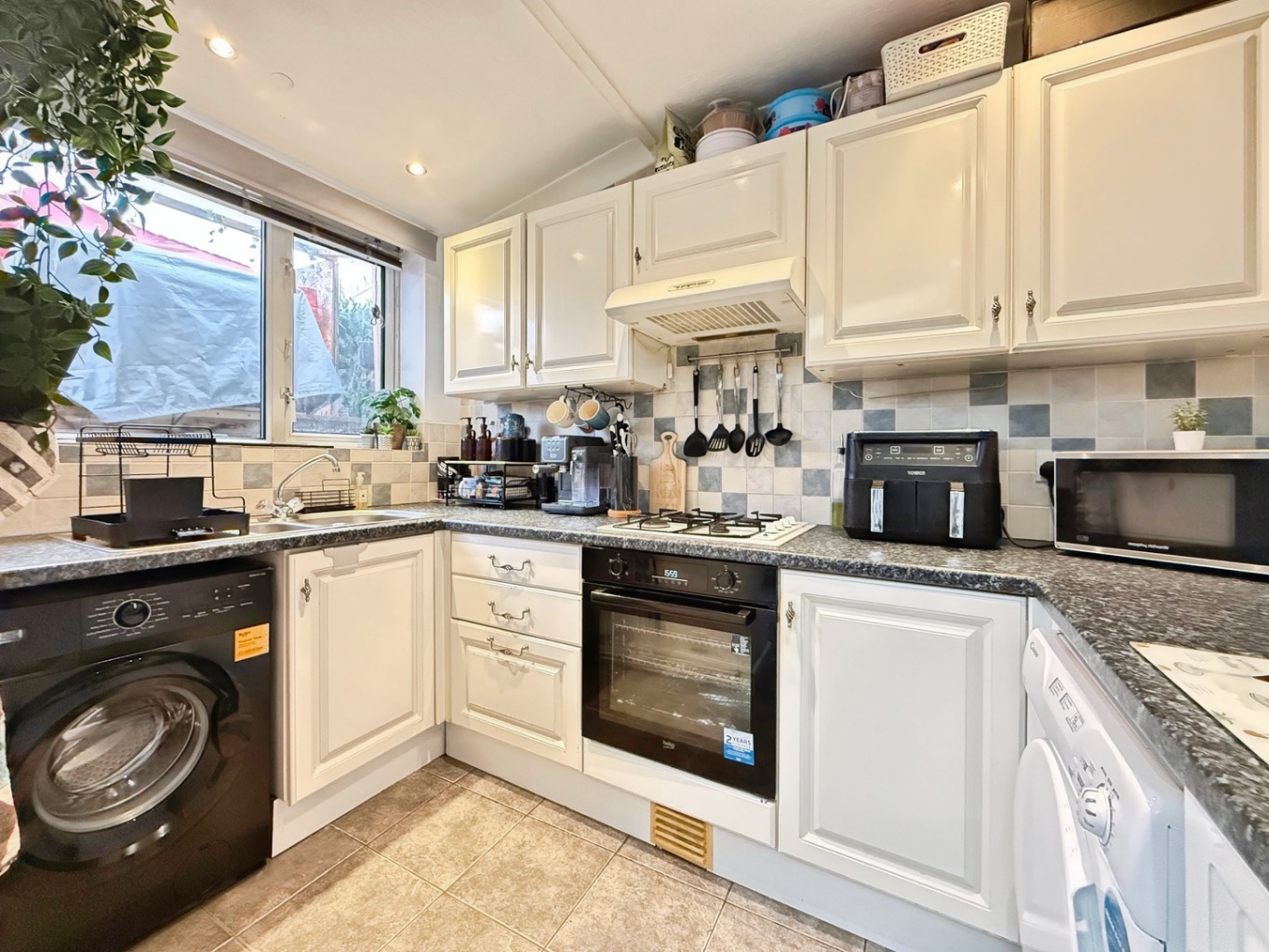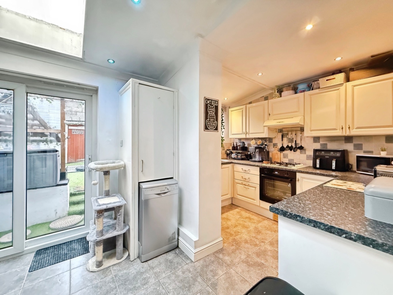 Fitted with a range of matching wall and base units with work surface over, 1 1/2 bowl stainless steel sink with mixer tap, integrated four ring gas hob with oven under and concealed extractor above, space for washing machine and tumble dryer, space for freestanding American style fridge/freezer, spotlights to ceiling, velux style window, uPVC double glazed sliding doors to rear garden, tiled flooring.