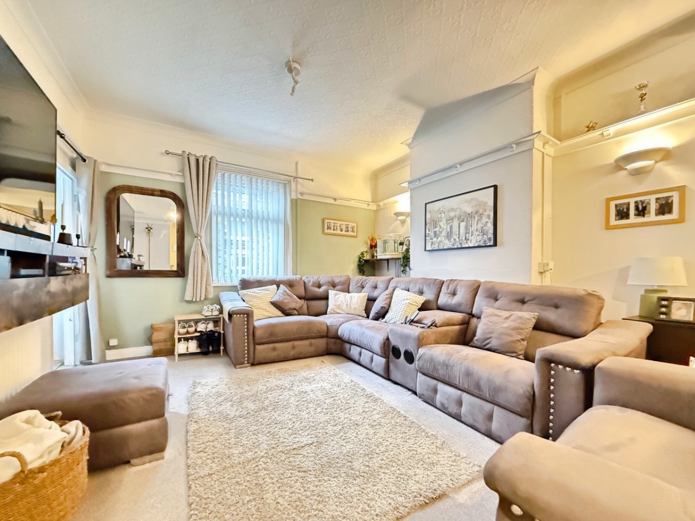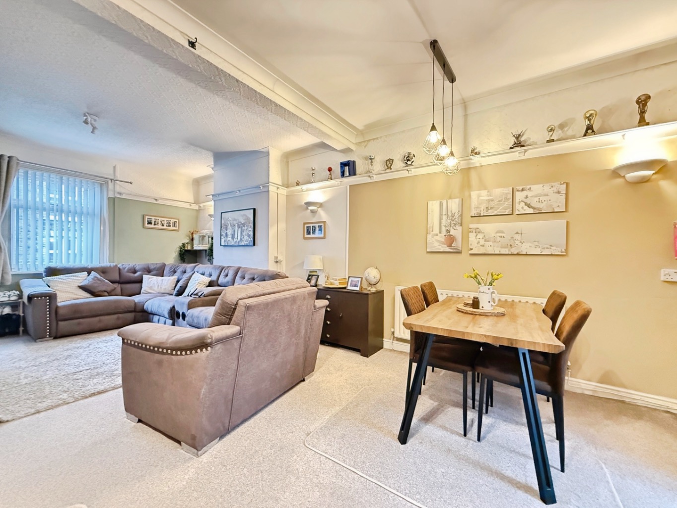Carpeted underfoot, uPVC double glazed window to front elevation, radiator, coving to ceiling, open plan into: