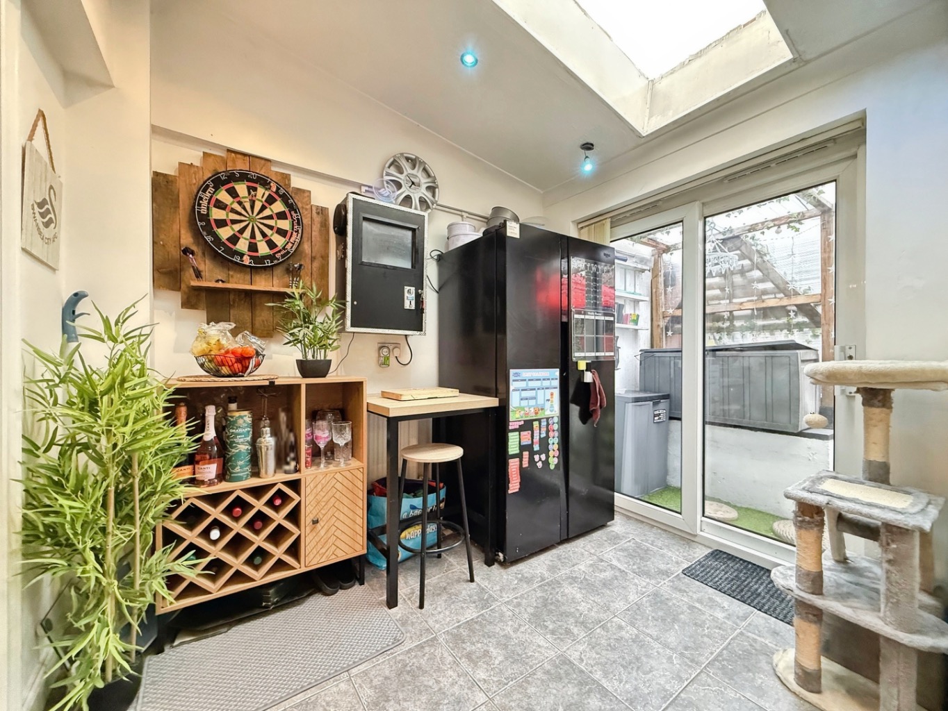 Externally, the home boasts a low-maintenance rear garden designed for ease and enjoyment. The outdoor area includes a shed, bar area, and an external toilet, making it perfect for entertaining or relaxing.