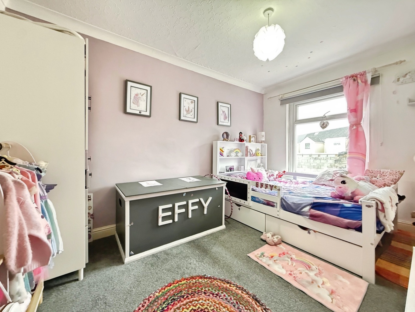 Carpeted underfoot, radiator, uPVC double glazed window x2 to front elevation, coving to ceiling.