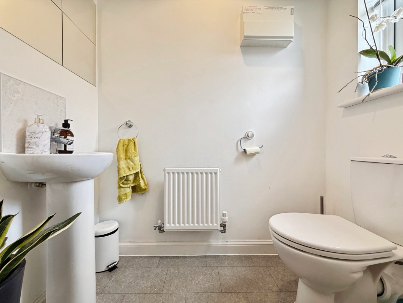 Fitted with a white two piece suite comprising of W/C, pedestal wash hand basin with tiled splashback, radiator, uPVC double glazed frosted window to front elevation.