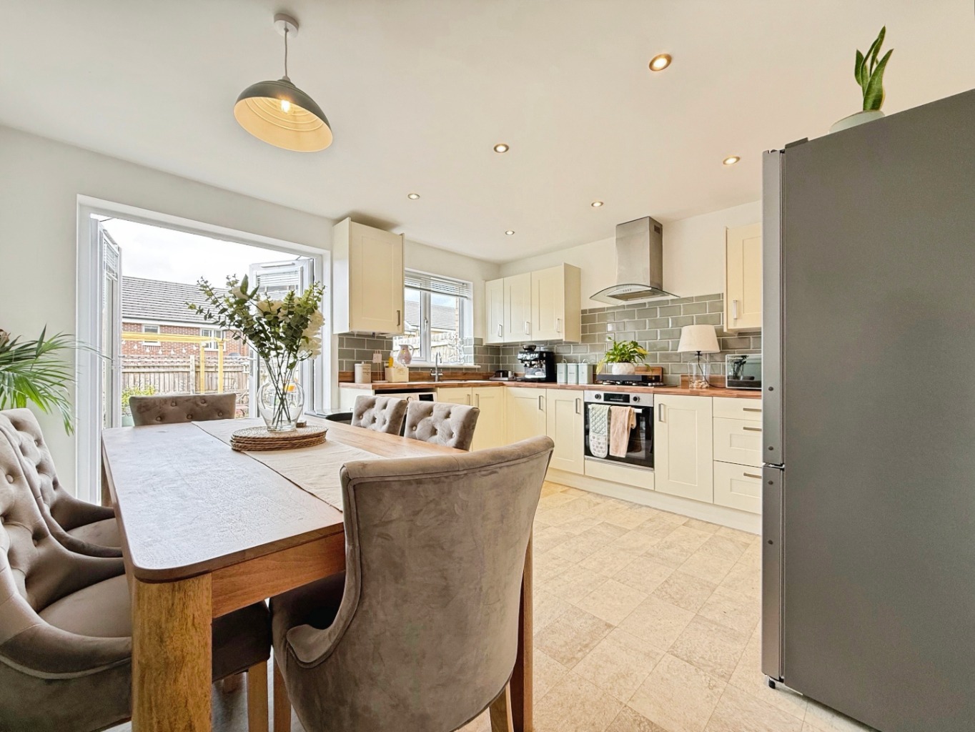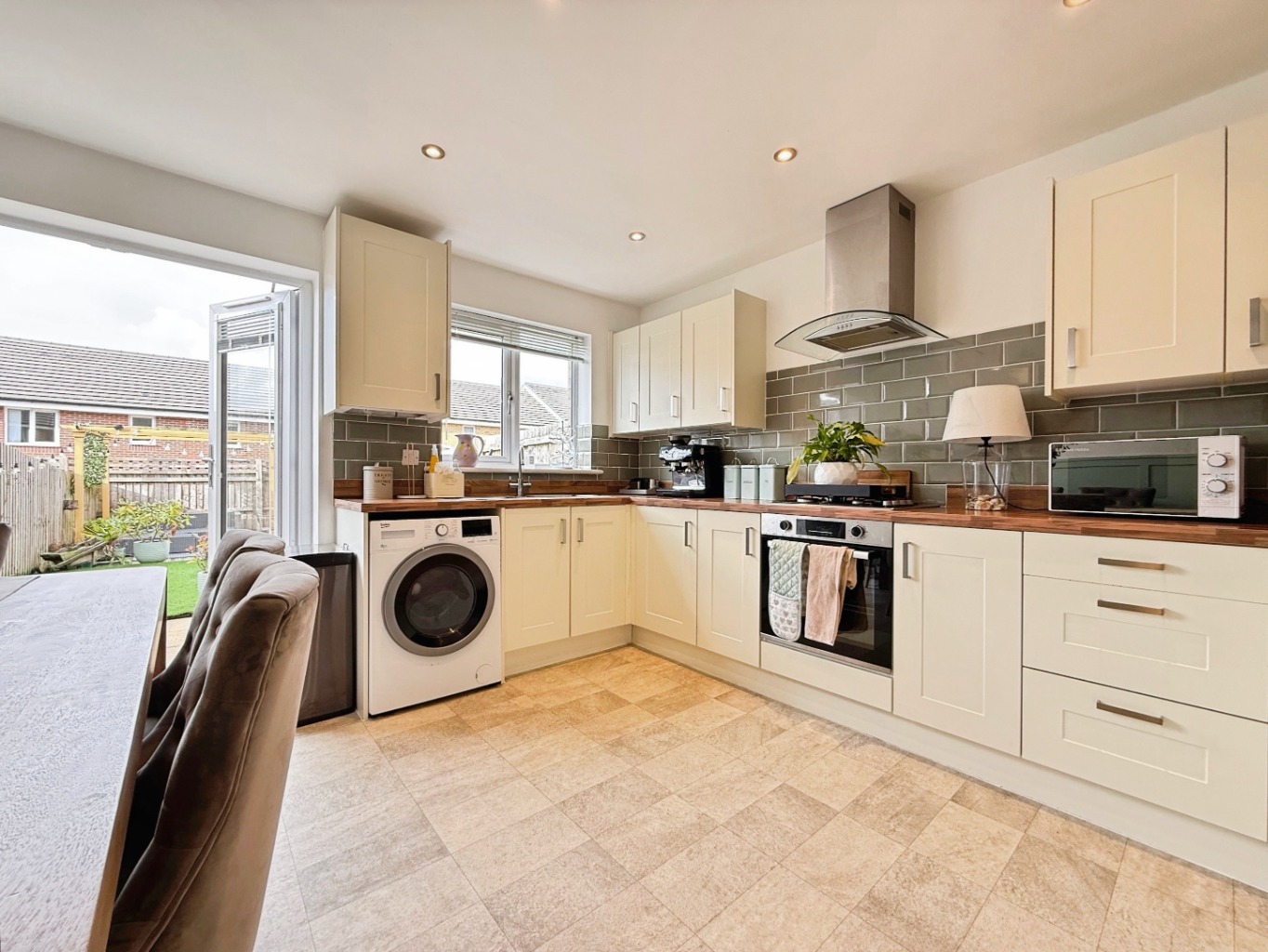 Fitted with a range of matching wall and base units with complimentary work surface over, inset stainless steel sink with drainer and mixer tap, integrated electric oven with gas gob and extractor over, plumbing for washing machine, space for fridge/freezer, tiled splashback, tile effect flooring, storage cupboard, spotlights to ceiling, radiator, uPVC double glazed window to rear elevation, uPVC double glazed patio doors to rear elevation.