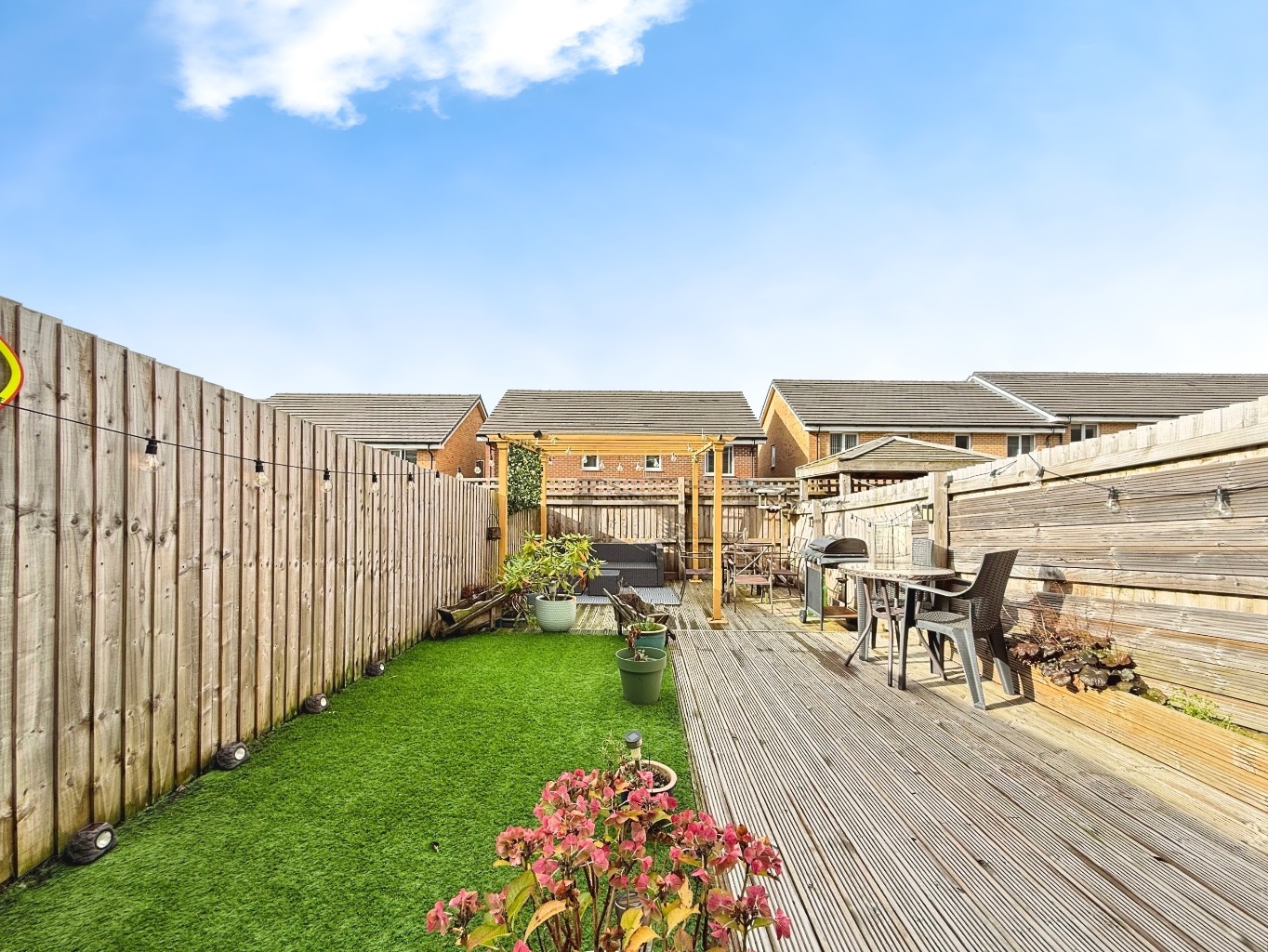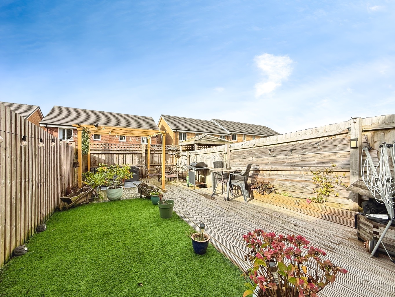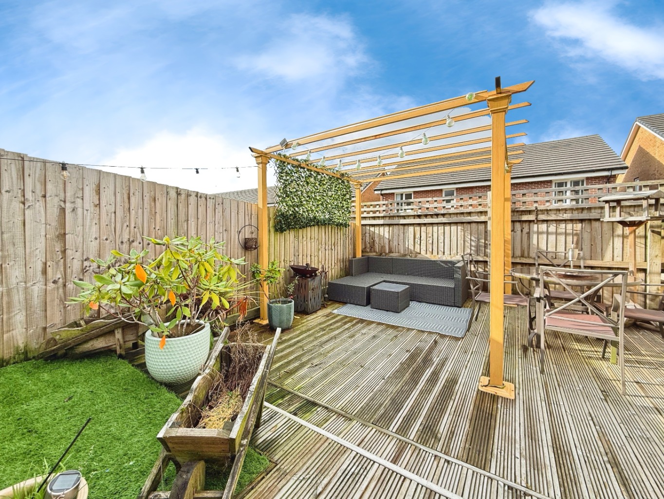 To the rear of the property there is a landscaped, low maintenance garden featuring patio and decked area with a pergola to the rear.