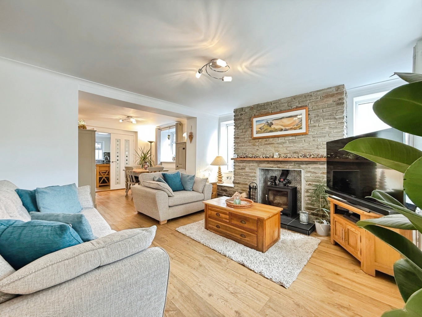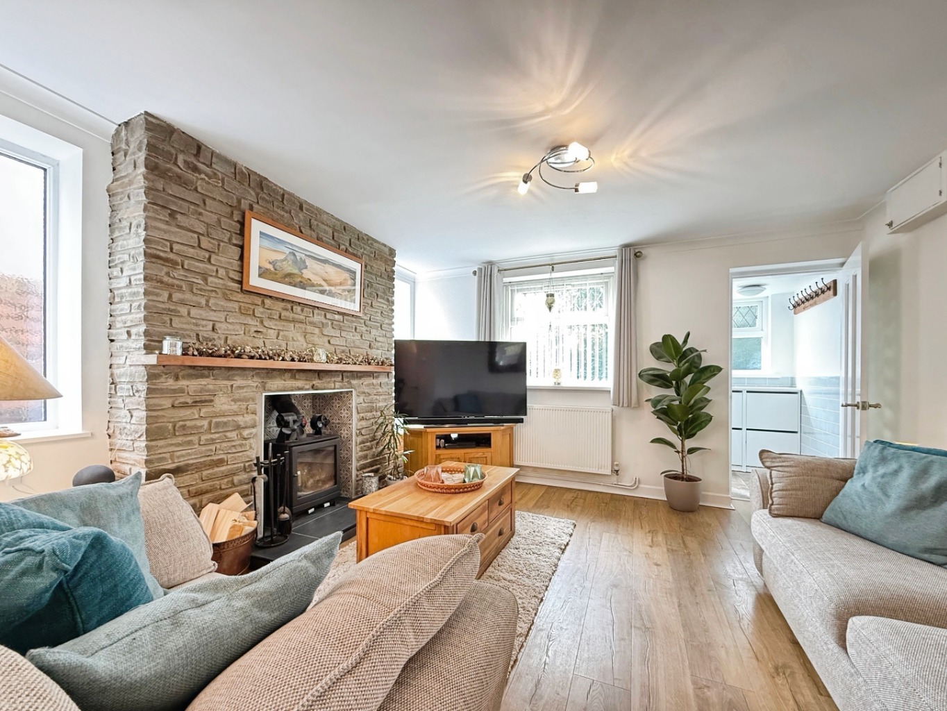 Wooden effect laminate flooring underfoot, uPVC double glazed window to front elevation, uPVC double glazed frosted window x2 to side elevation, feature multi fuel wood burner set on tiled hearth and tiled splash back with brick surround, coving to ceiling, radiator, wall mounted consumer unit, opening into: