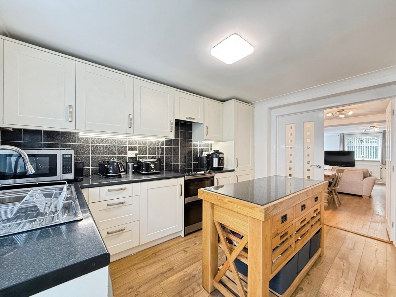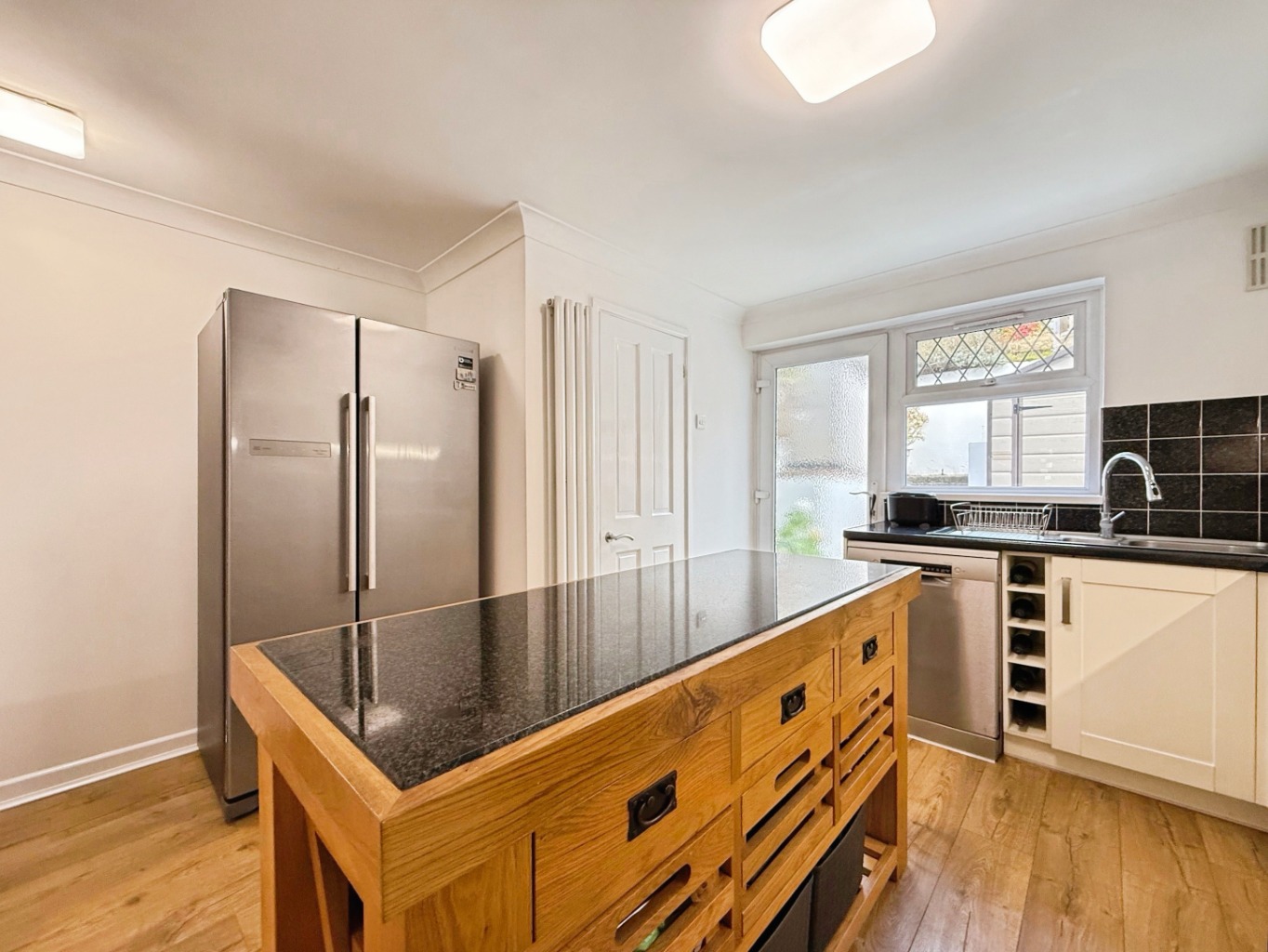 Fitted with a range of matching wall and base units with complimentary work surface over, 1 1/2 bowl stainless steel sink with mixer tap, space for dishwasher, wine rack, space for freestanding cooker with concealed extractor above, space for American style fridge/freezer, vertical radiator, wooden effect laminate flooring, uPVC double glazed window and door to rear elevation, door into: