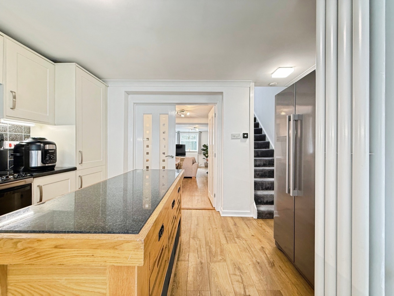 Wooden effect laminate flooring underfoot, Under stairs storage cupboard, uPVC double glazed window to side elevation, radiator, internal glazed double door into: