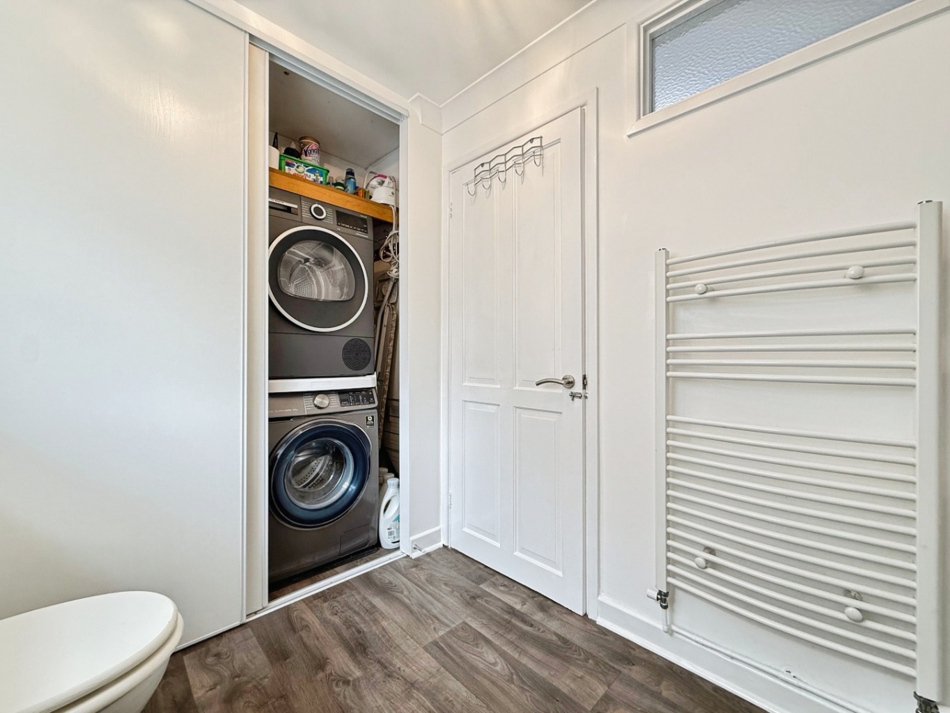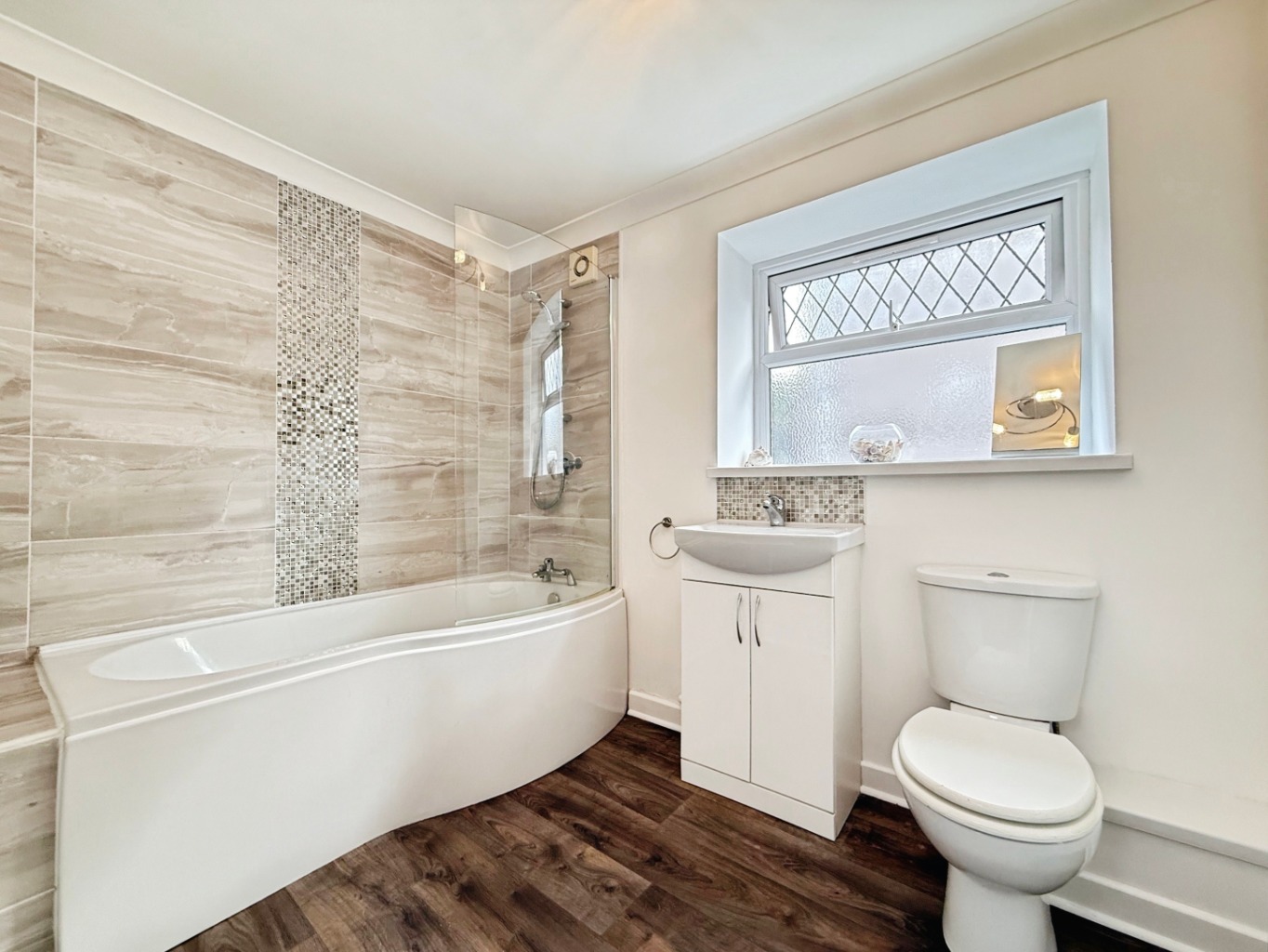 Fitted with a white three piece suite comprising of W/C, sink set in vanity unit, paneled bath with shower overhead and glass modesty screen, partly tiled walls, extractor fan, uPVC double glazed frosted window to side elevation, heated towel rail, wooden effect flooring, built in sliding door storage with space and plumbing for washing machine and tumble dryer.