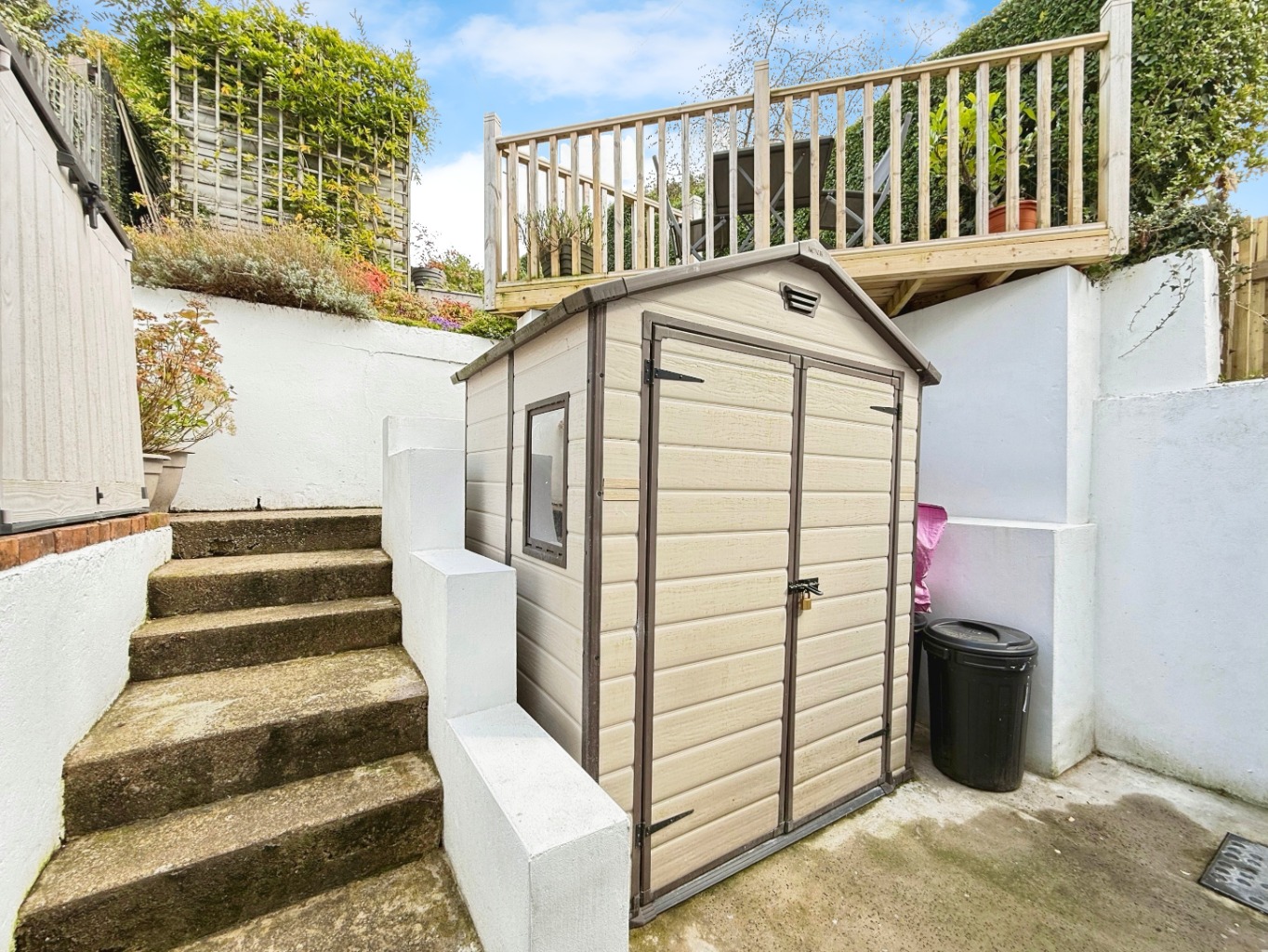 To the rear there is a fantastic tiered garden featuring a low level storage area for shed and bin storage. Tier one features a bistro decked area for a table and two chairs with a pathway giving access to lawn space and storage shed area featuring power and lighting. The top tier comprises of a large sun deck with scenic views and the perfect area for sunbathing and family barbecues.