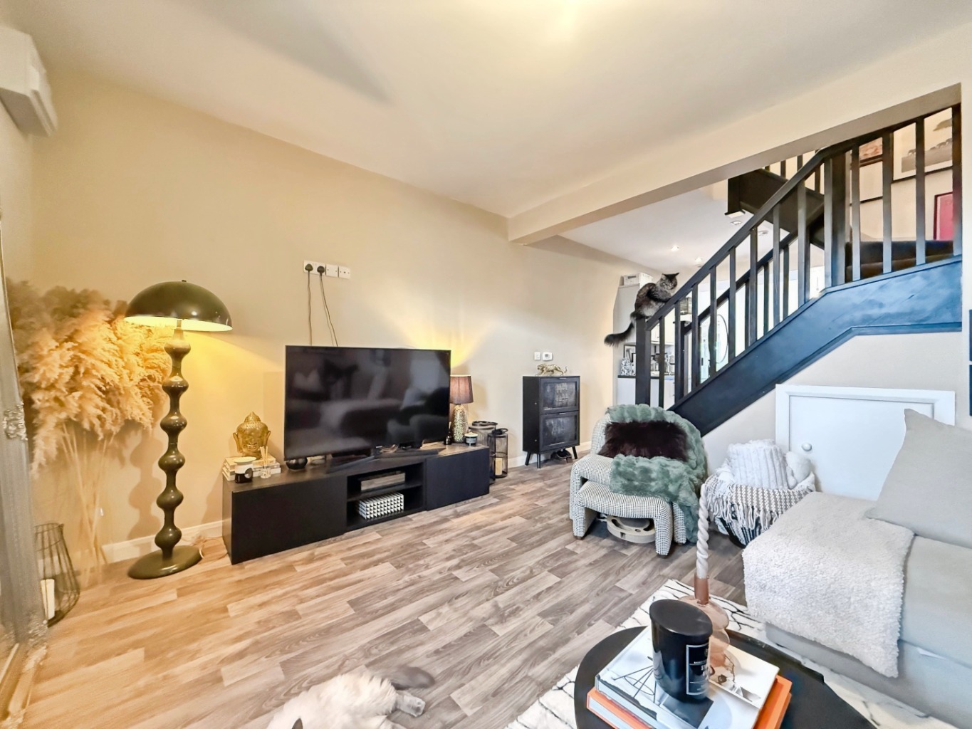 Open plan area with carpeted stairs to first floor, underfloor heating, wooden effect flooring, opening through to: