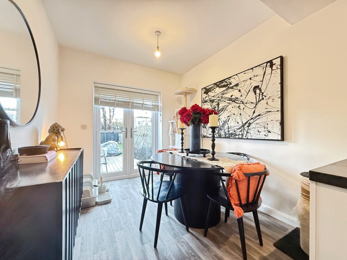 Spotlights to ceiling, wooden effect vinyl flooring, uPVC double glazed patio doors to rear elevation.