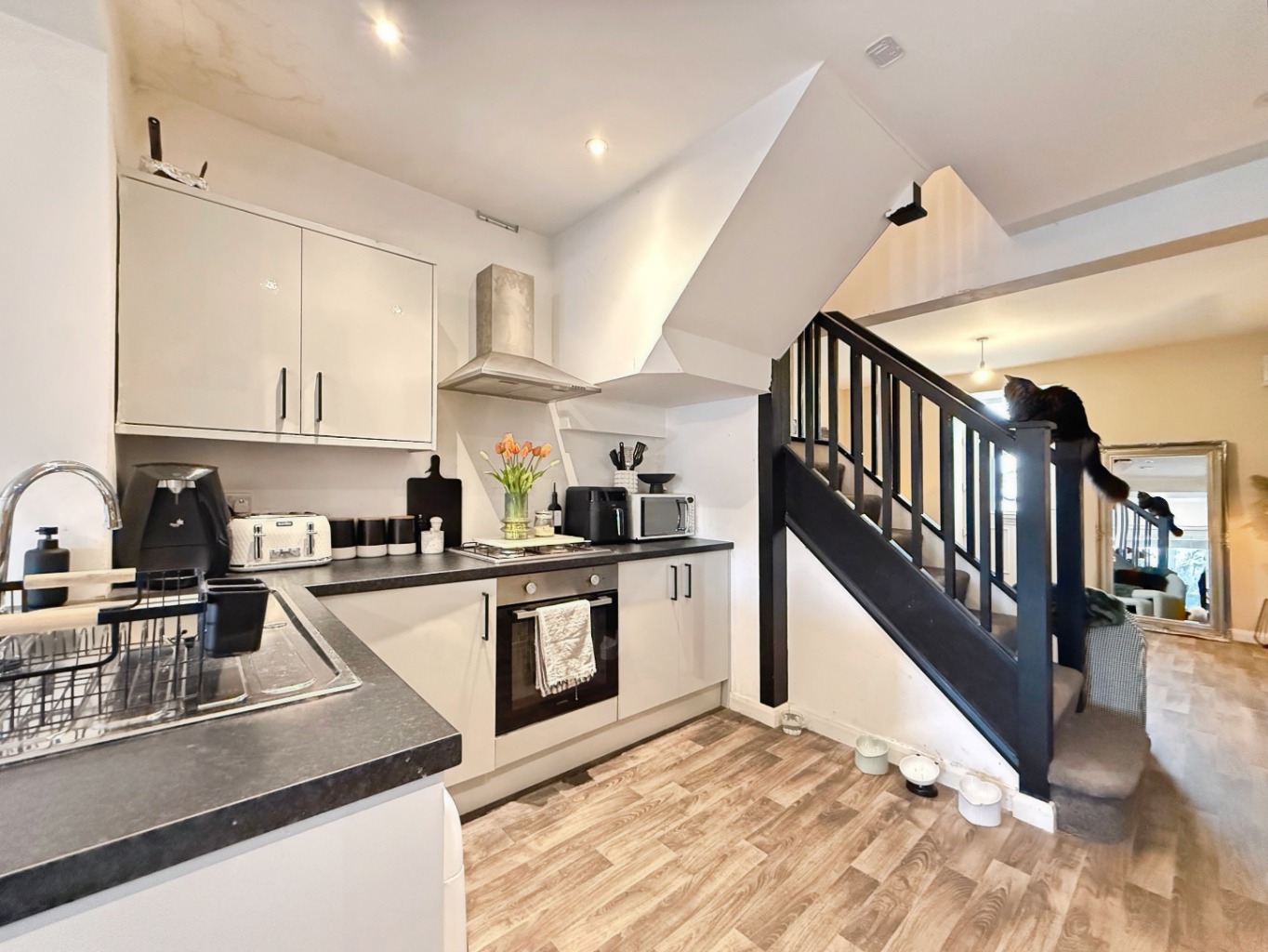 The property is approached via steps leading up to the front entrance, opening into a stylish and welcoming lounge. To the rear, an attractive open-plan kitchen/diner provides a contemporary and functional living space, finished with modern fittings and ideal for both everyday living and entertaining.