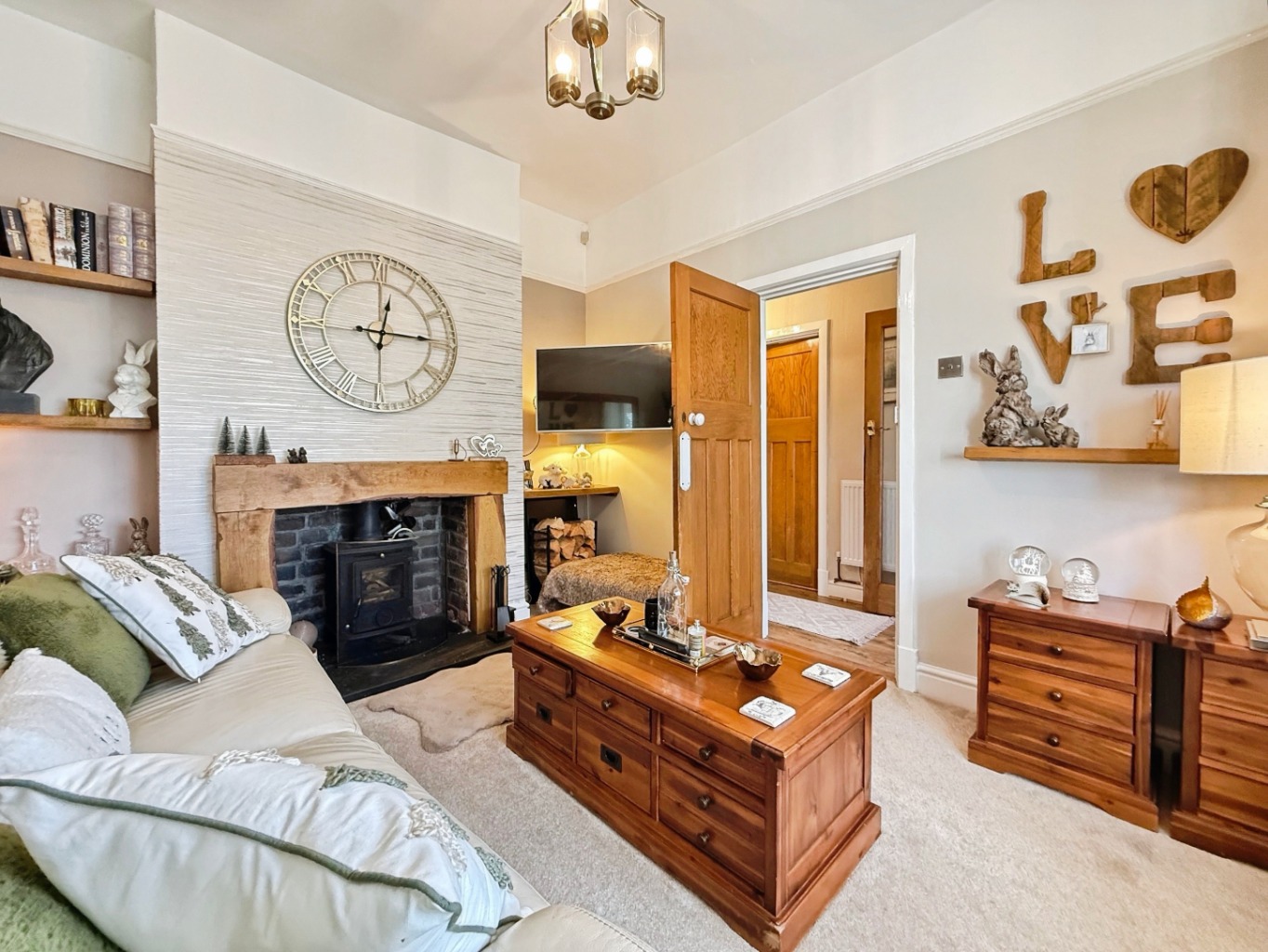 Carpeted underfoot, uPVC double glazed bay style window with shutter blinds to front elevation, radiator, feature log burner with slate hearth and wooden surround.