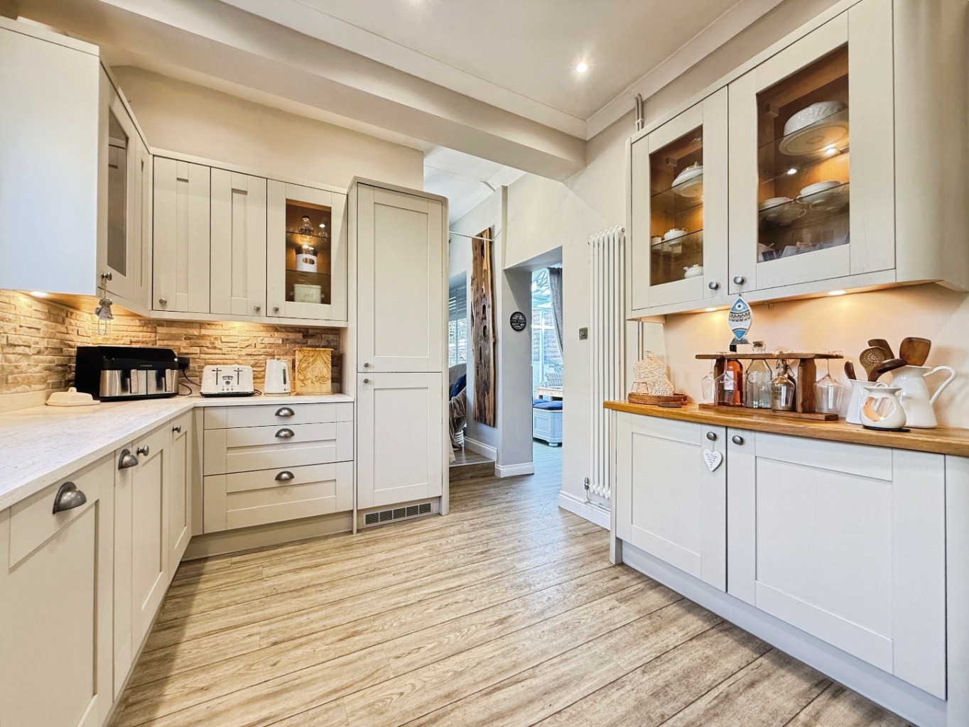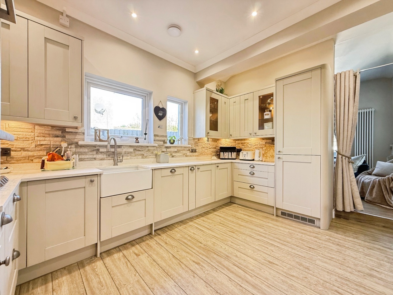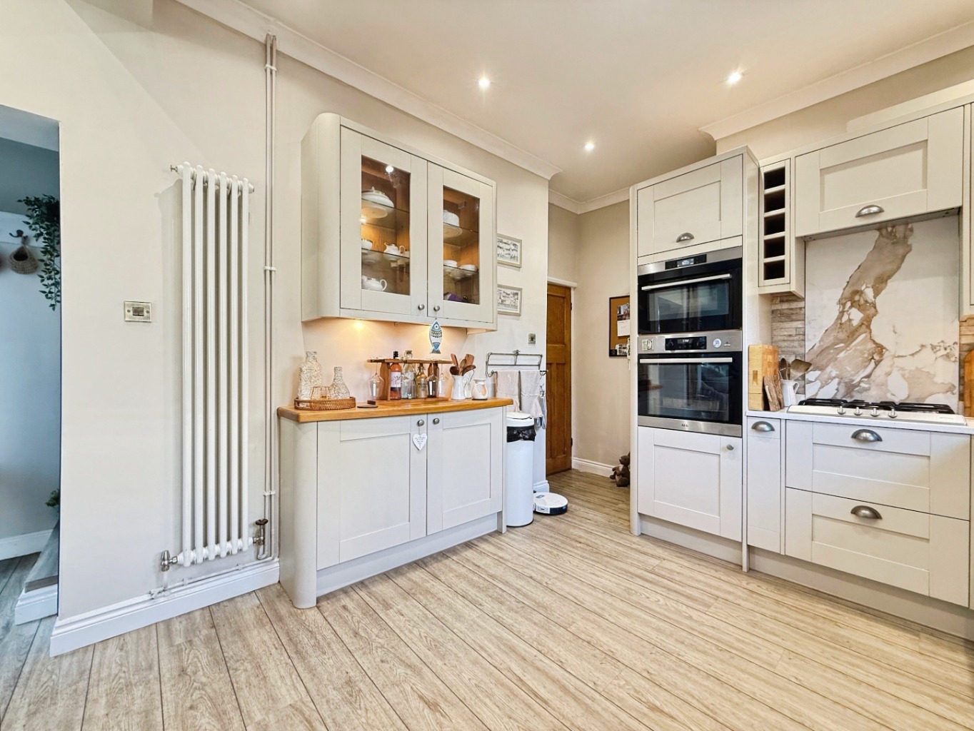 Fitted with a ultra modern kitchen from Magnet featuring a range of stylish wall and base units with complimentary 'quartz' work surfaces and upstands, Belfast sink with mixer tap, integrated fridge/freezer, integrated dishwasher, four ring 'SMEG' gas hob with extractor over and feature tiled spashback, wine rack, integrated eye level oven and grill, integrated microwave feature, vertical radiator, spotlights to ceiling, wooden style flooring, coving to ceiling, opening into: