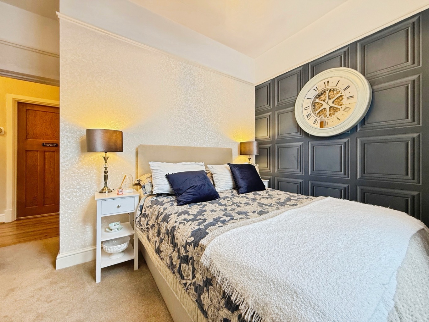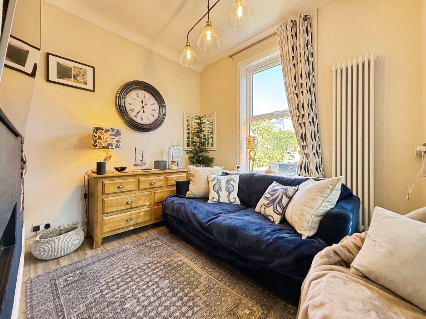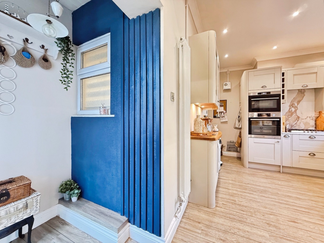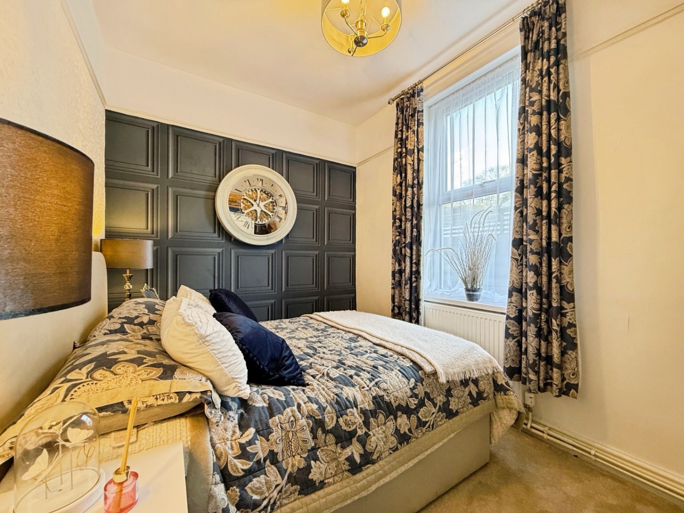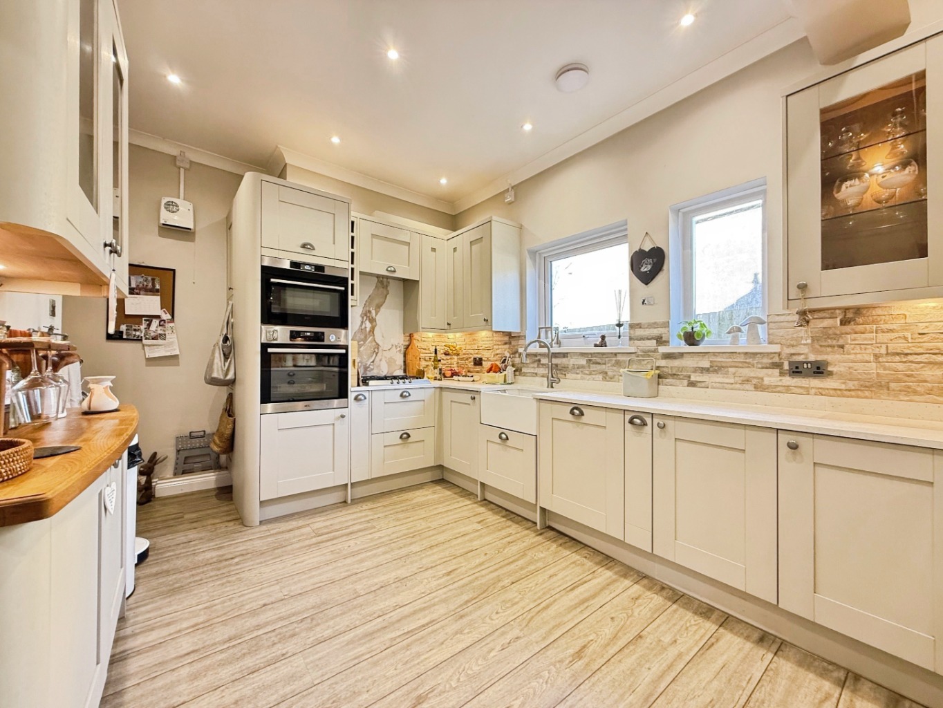 Inside, the welcoming lounge features a striking log burner and an elegant bay window fitted with shutter blinds, flooding the space with natural light. The modern Magnet-designed kitchen is a standout feature, complete with sleek quartz worktops, matching upstands, and high-quality integrated appliances. A versatile study/third bedroom provides an additional cosy retreat, enhanced by a bespoke TV media wall and fireplace.