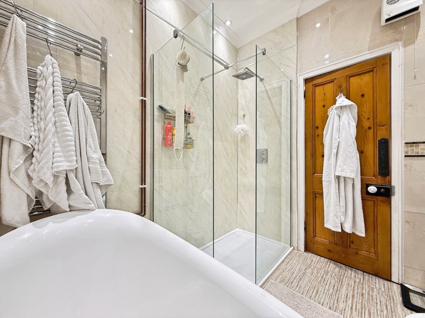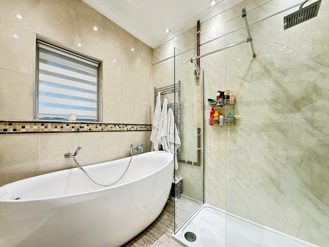 Fitted with a white four piece suite comprising of W/C, pedestal wash hand basin, freestanding bath with freestanding tap, shower attachment, walk in shower cubicle with glass modesty screen, respatex walls, extractor fan heater, heated towel rail, spotlights to ceiling, uPVC double glazed window to rear, tiled flooring.