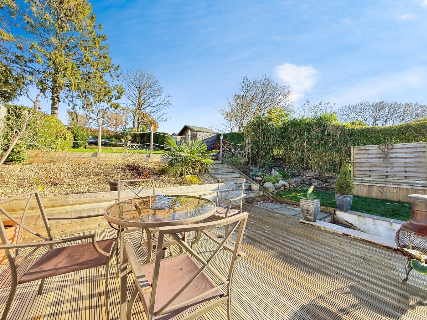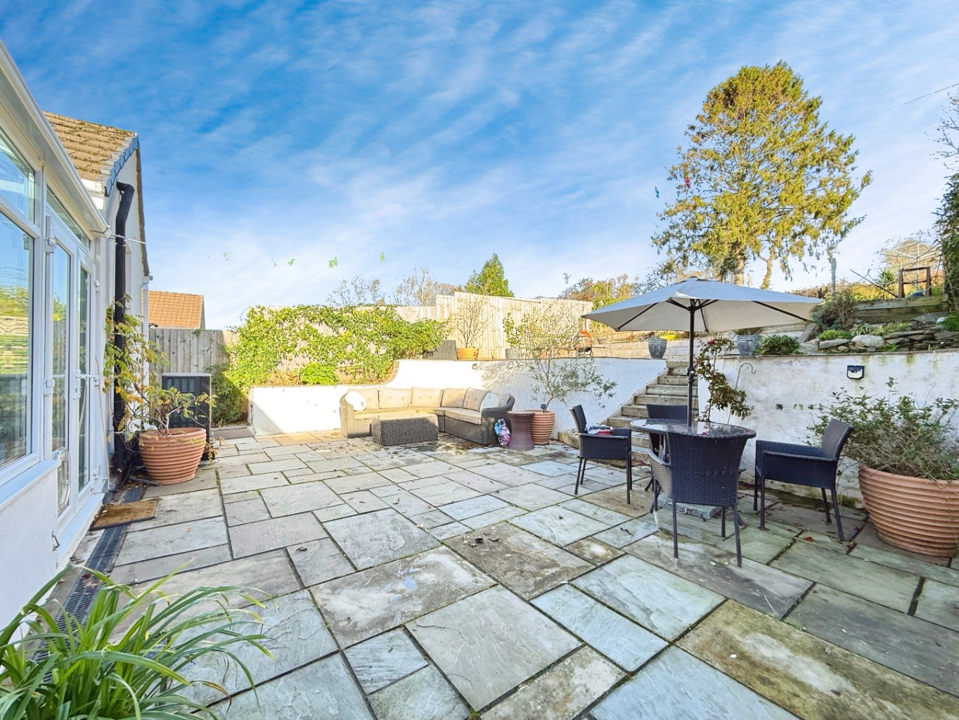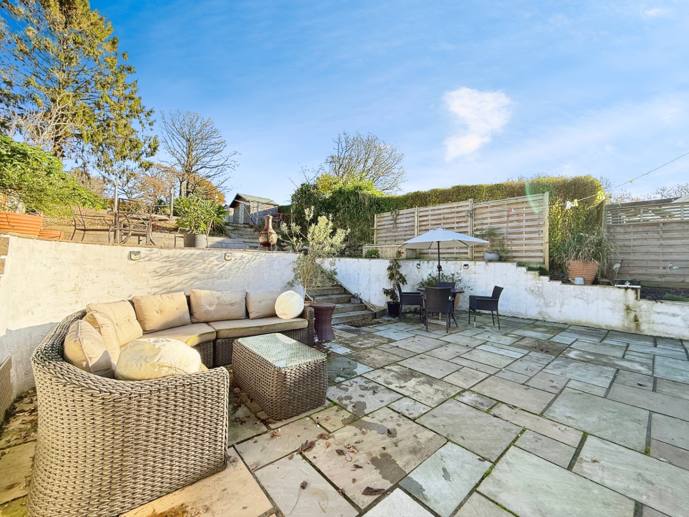 To the rear of the property there is a large tiered garden that features a large patio, steps up to decked area and large lawn space with solar panels to the rear. The outside space features lighting and backs onto green space.