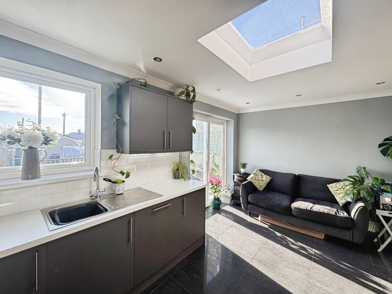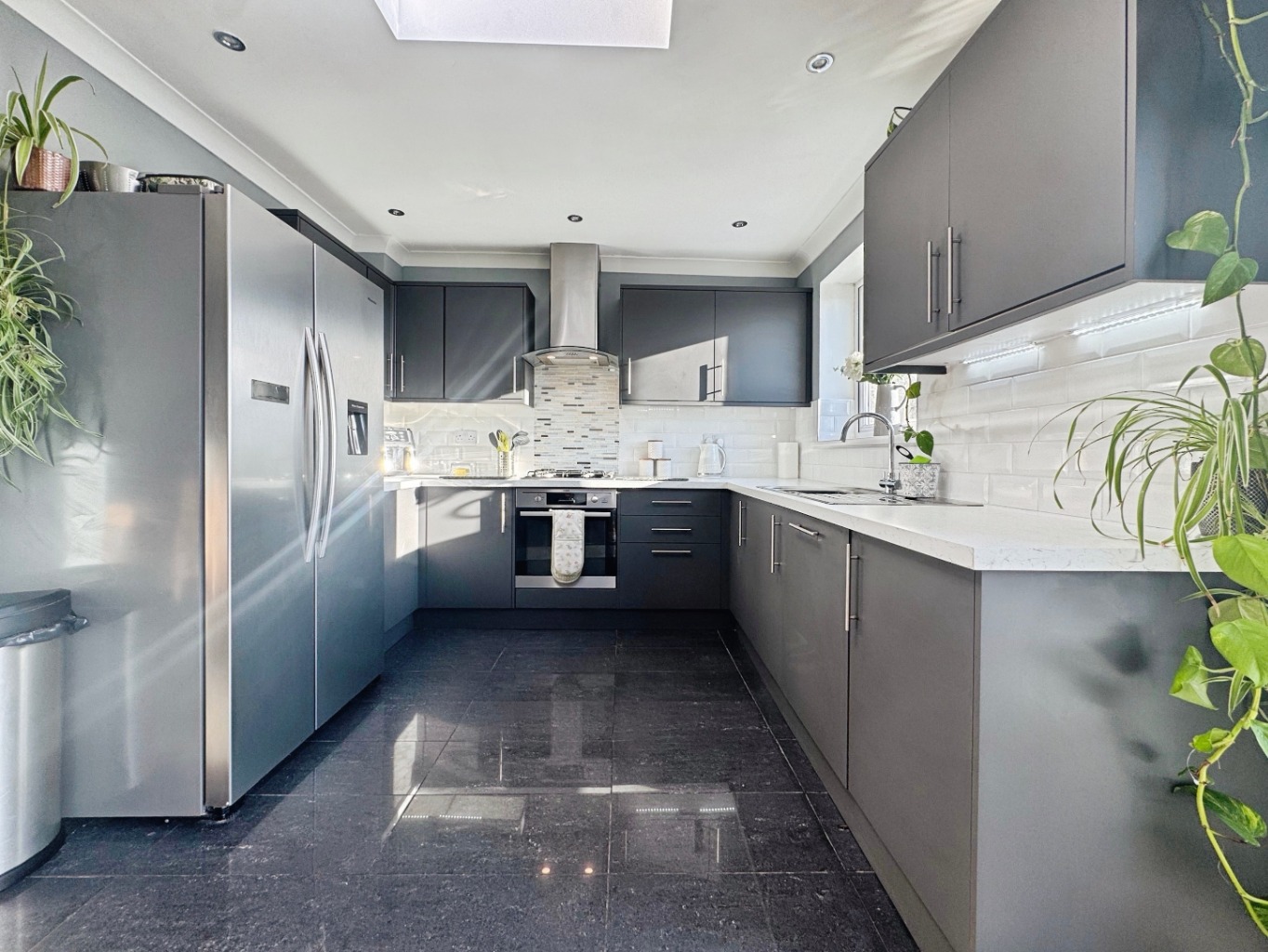 Fitted with a range of modern wall and base units with work surface over, four ring gas hob with electric ice under and extractor fan over, space for American fridge/freezer, stainless steel sink with drainer and mixer tap, integrated dishwasher, uPVC double glazed window, uPVC double glazed sliding patio doors, tiled floor, coving and spotlights to ceiling, uPVC double glazed glass lantern to ceiling.
