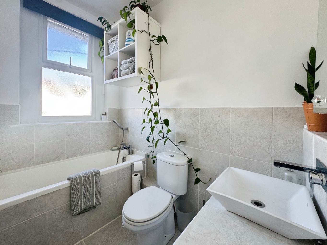 Fitted with a three piece suite comprising of bath with hand shower over, w.c and wash hand basin, tiled flooring, par tiled walls, chrome heated towel warmer, spotlights to ceiling, obscure uPVC double glazed window.