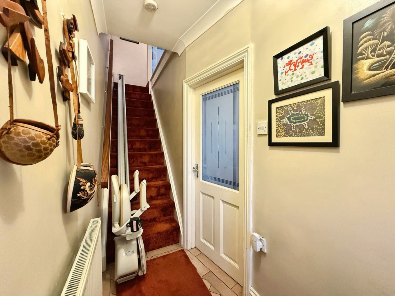 Tiled underfoot, carpeted stairs to first floor accommodation, radiator, door into: