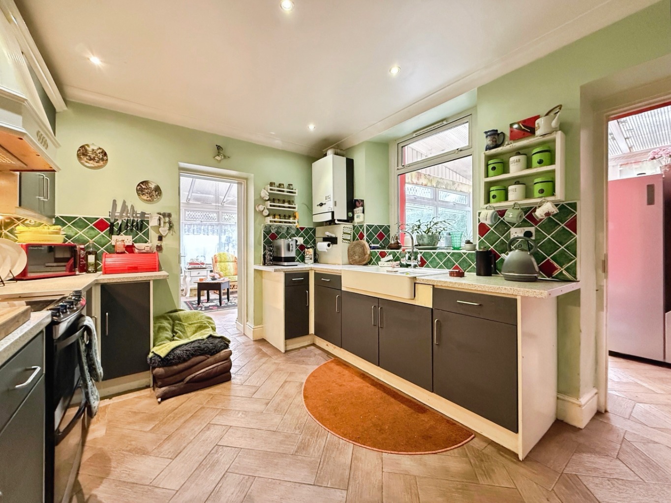 Fitted with a range of matching wall and base units with work surface over, belfast double sink with mixer tap, 6 ring gas cooker with extractor over, wall mounted gas combination boiler, tiled splashback, tiled flooring, radiator, window to side, door into: