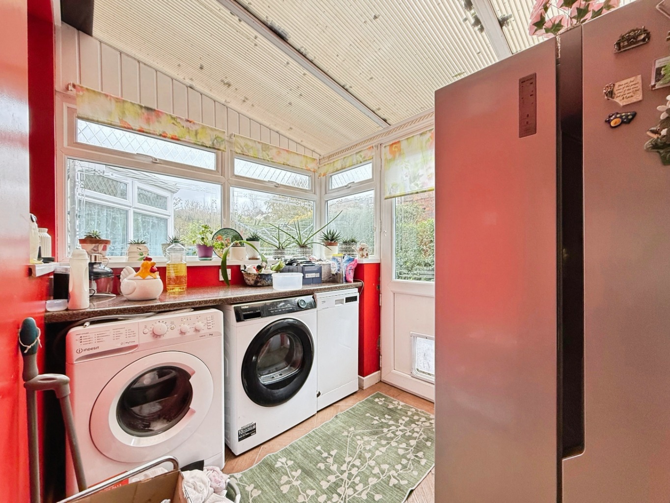 Accessed via kitchen, uPVC doors, windows & polycarbonate roof, work surface with space underneath for washing machine, tumble dryer and space for fridge/freezer.