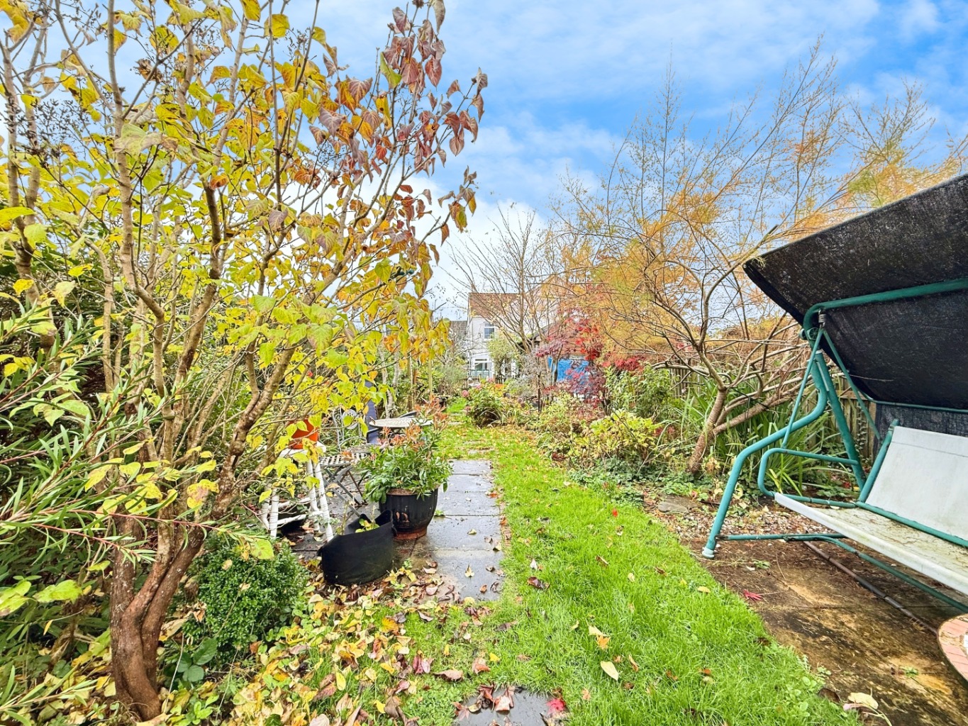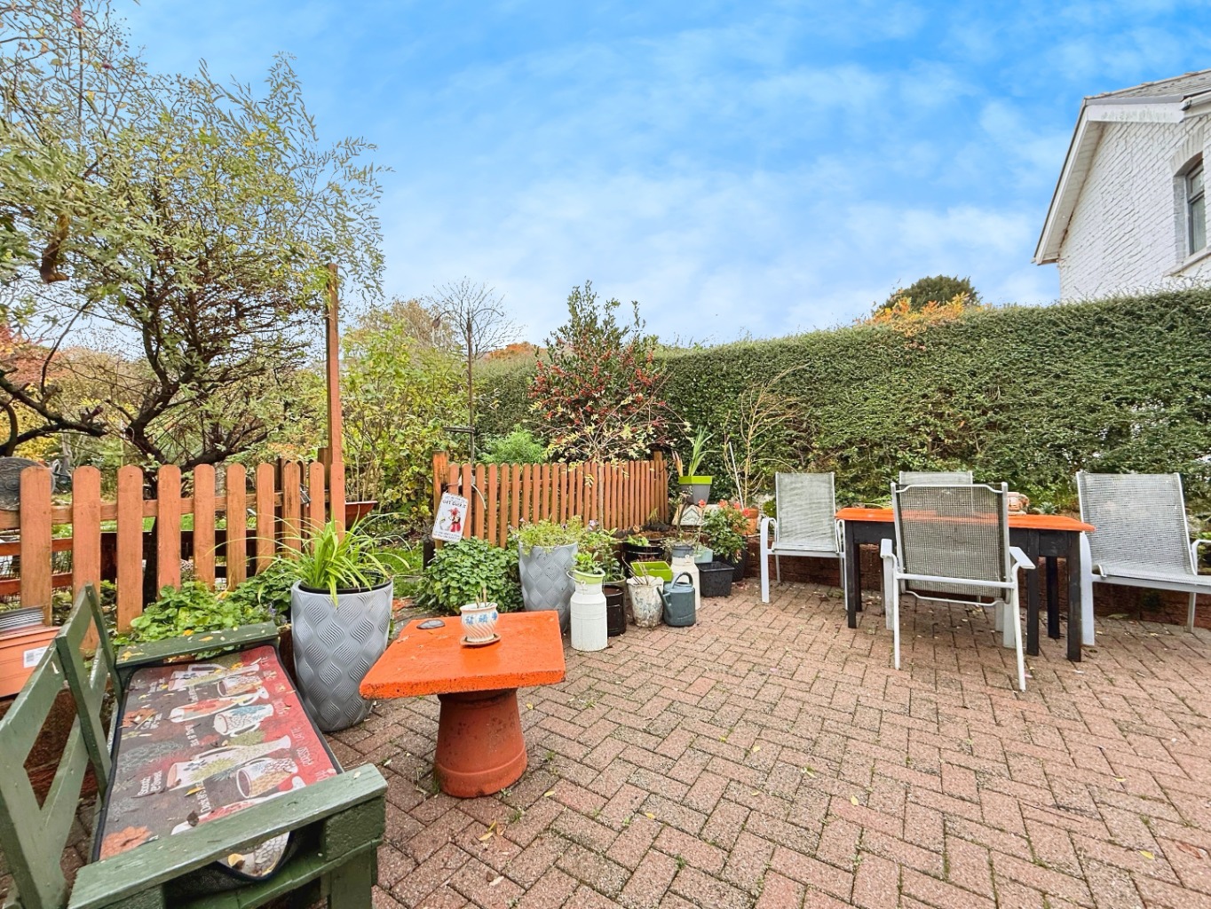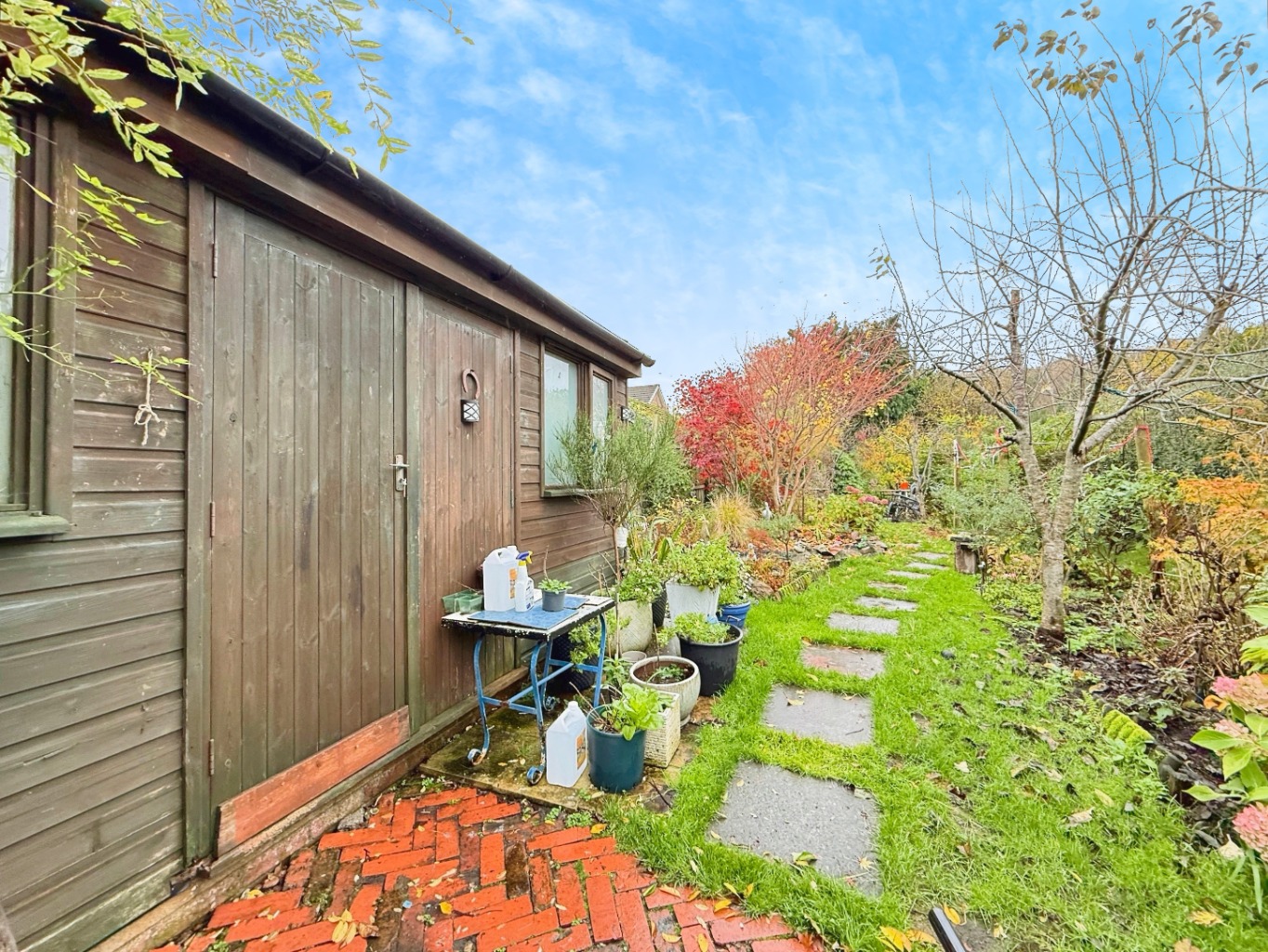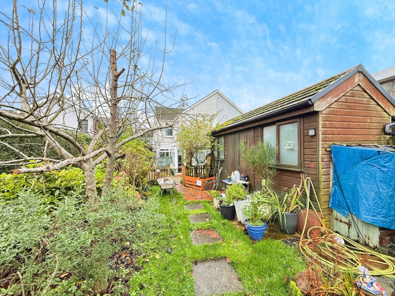 The large rear garden is a standout feature, boasting established apple and cooking-apple fruit trees, ample lawned space, an outbuilding, and an outside toilet, providing excellent potential for storage, hobbies, or further development (subject to any planning requirements).