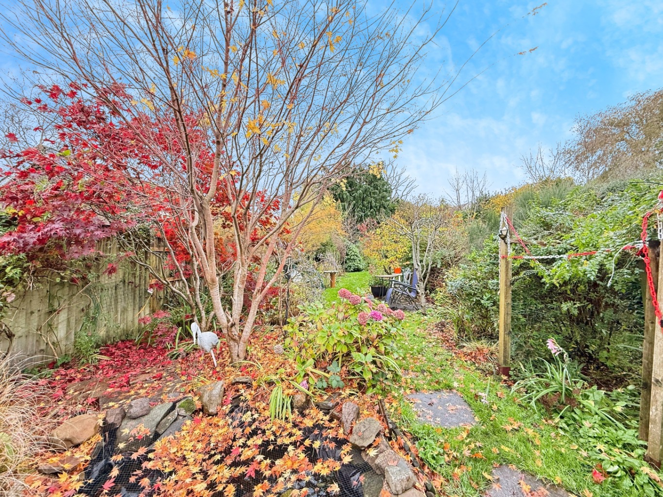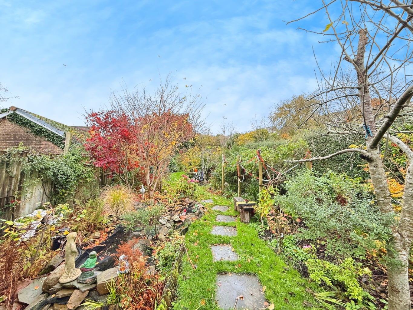 To the rear of the property there is a larger than average rear garden, patio area, large enclosed lawn space, fish pond, wooden shed featuring power and lighting currently used as a work shop, outside toilet.