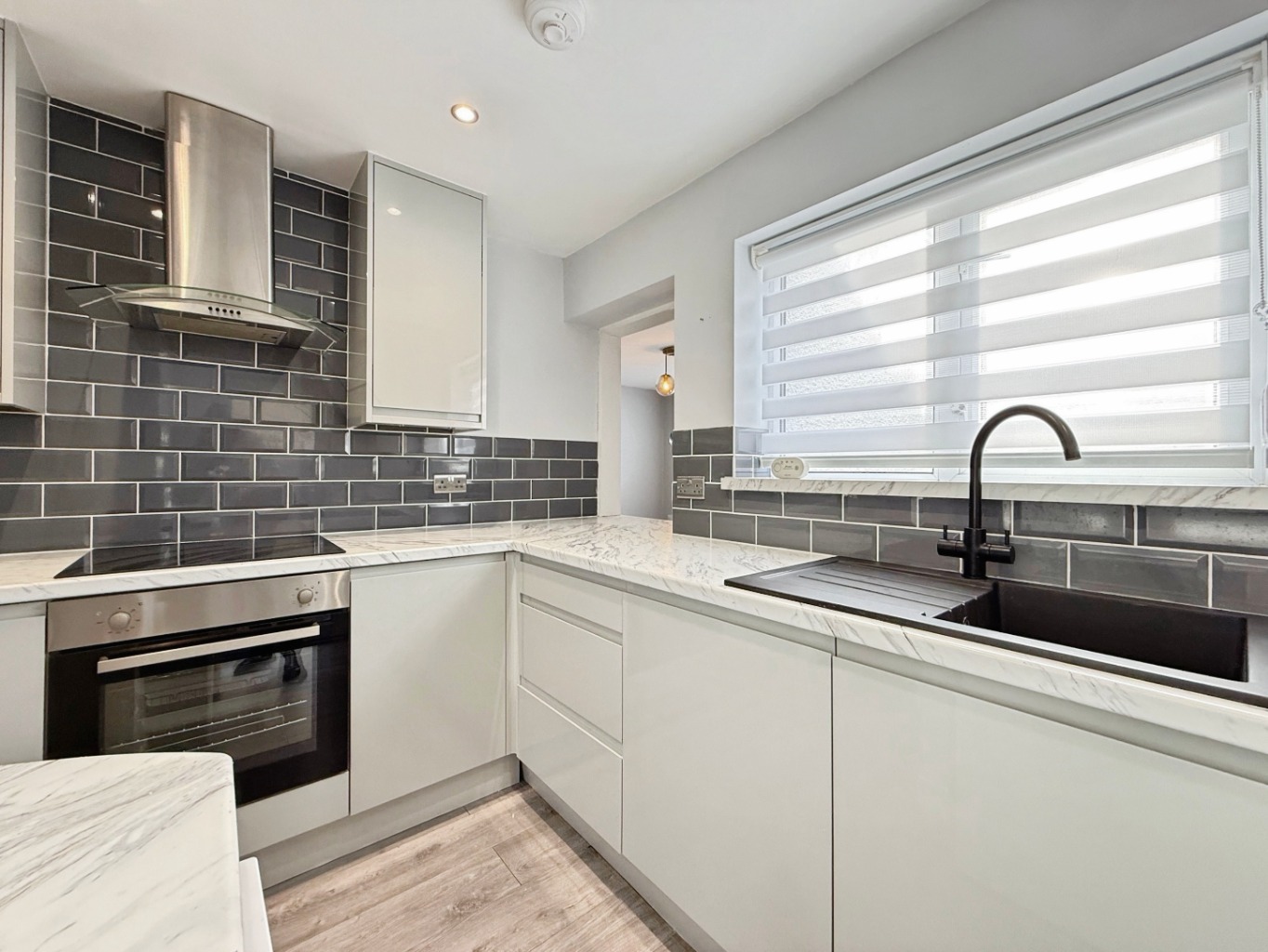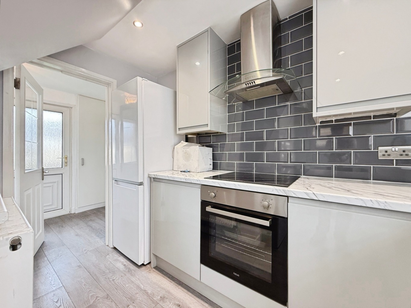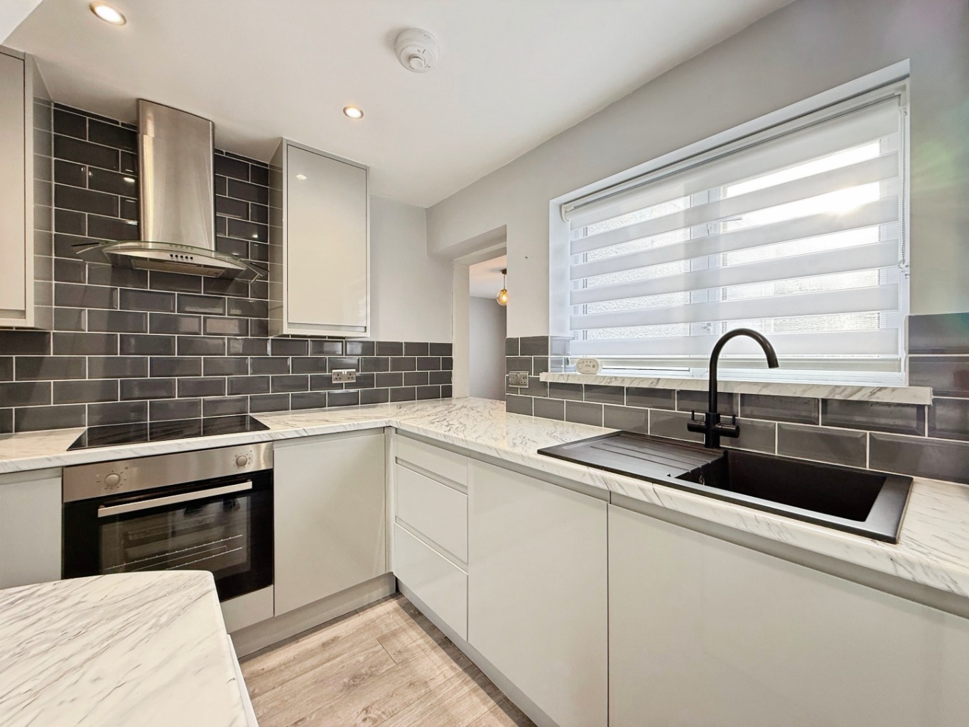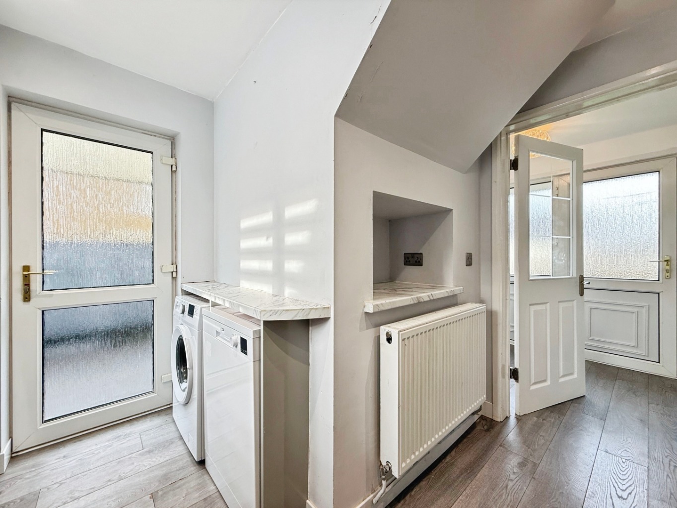 Fitted with a range of modern high gloss wall and base units in dove grey with complimentary work surface over, black composite sink with mixer tap, space for fridge/freezer, integrated oven, induction hob and extractor over, space for dishwasher, space for washing machine, tiled splash back, wall mounted gas combination boiler in concealed unit, radiator, uPVC double glazed window to rear elevation, uPVC double glazed door to side elevation, radiator, understairs alcove work surface area.