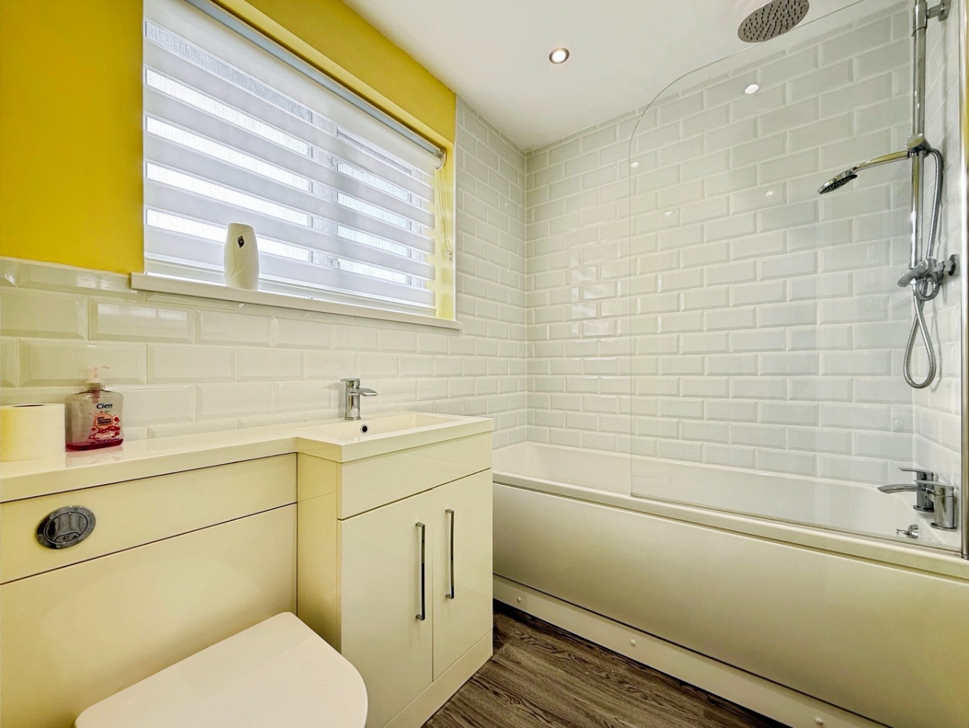 Fitted with a white three piece suite comprising of W/C & wash hand basin set in vanity unit, panelled bath with shower overhead and glass modesty screen, wooden effect flooring, radiator, tiled walls, uPVC double glazed frosted window to rear elevation.