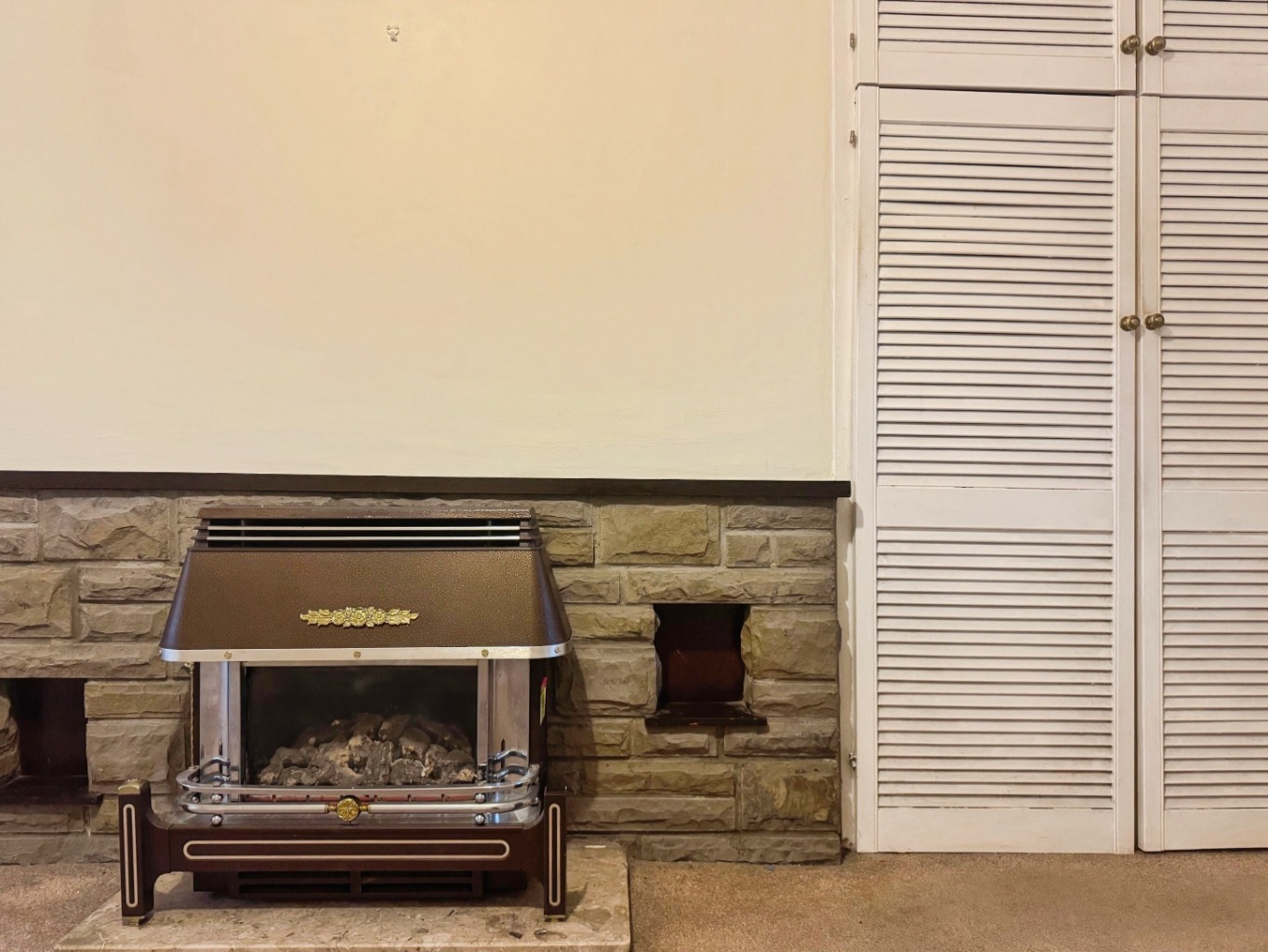 Radiator, decorative fireplace with brick surround and marble hearth, coving to ceiling, cupboard housing back boiler opening into: