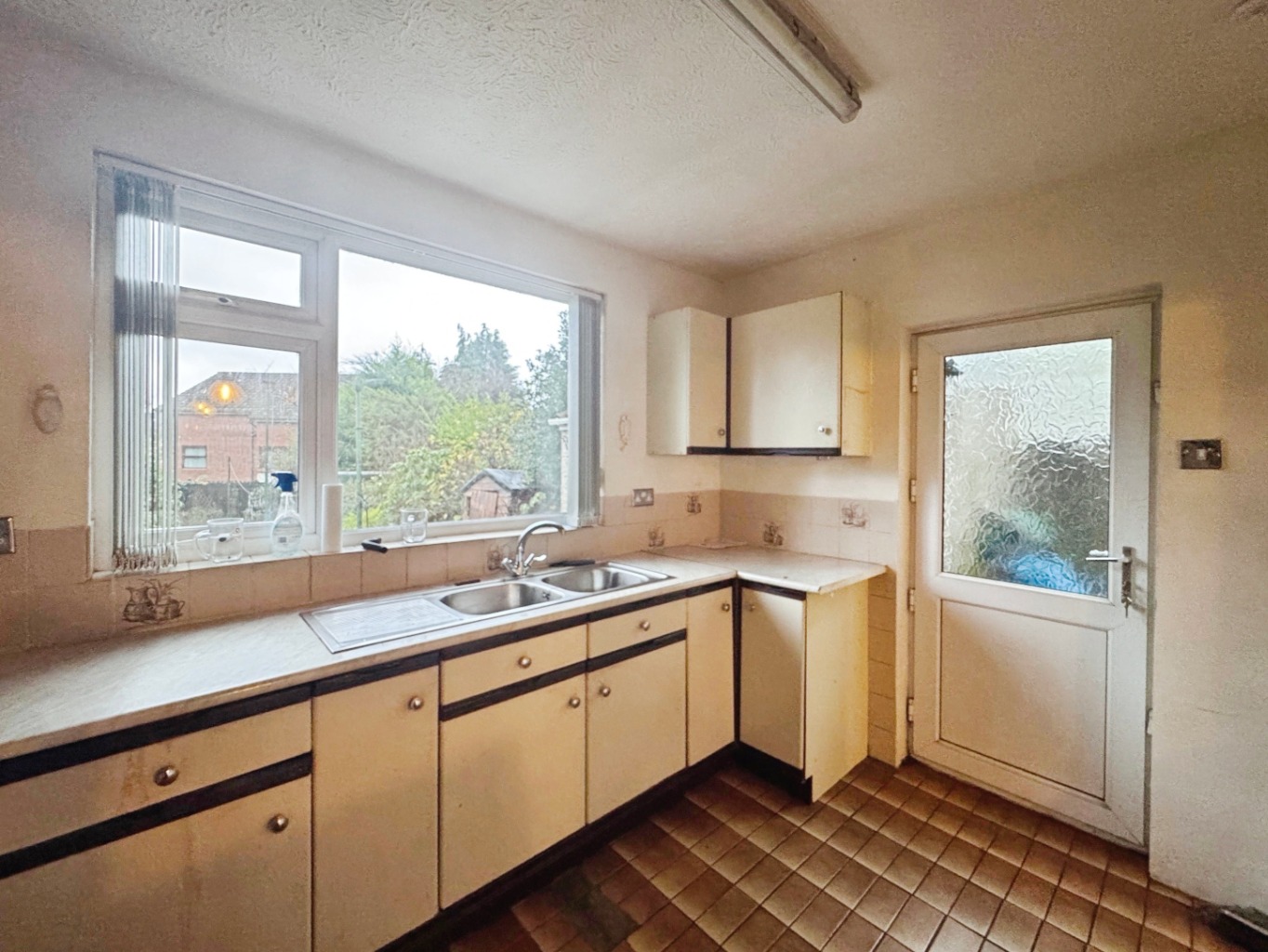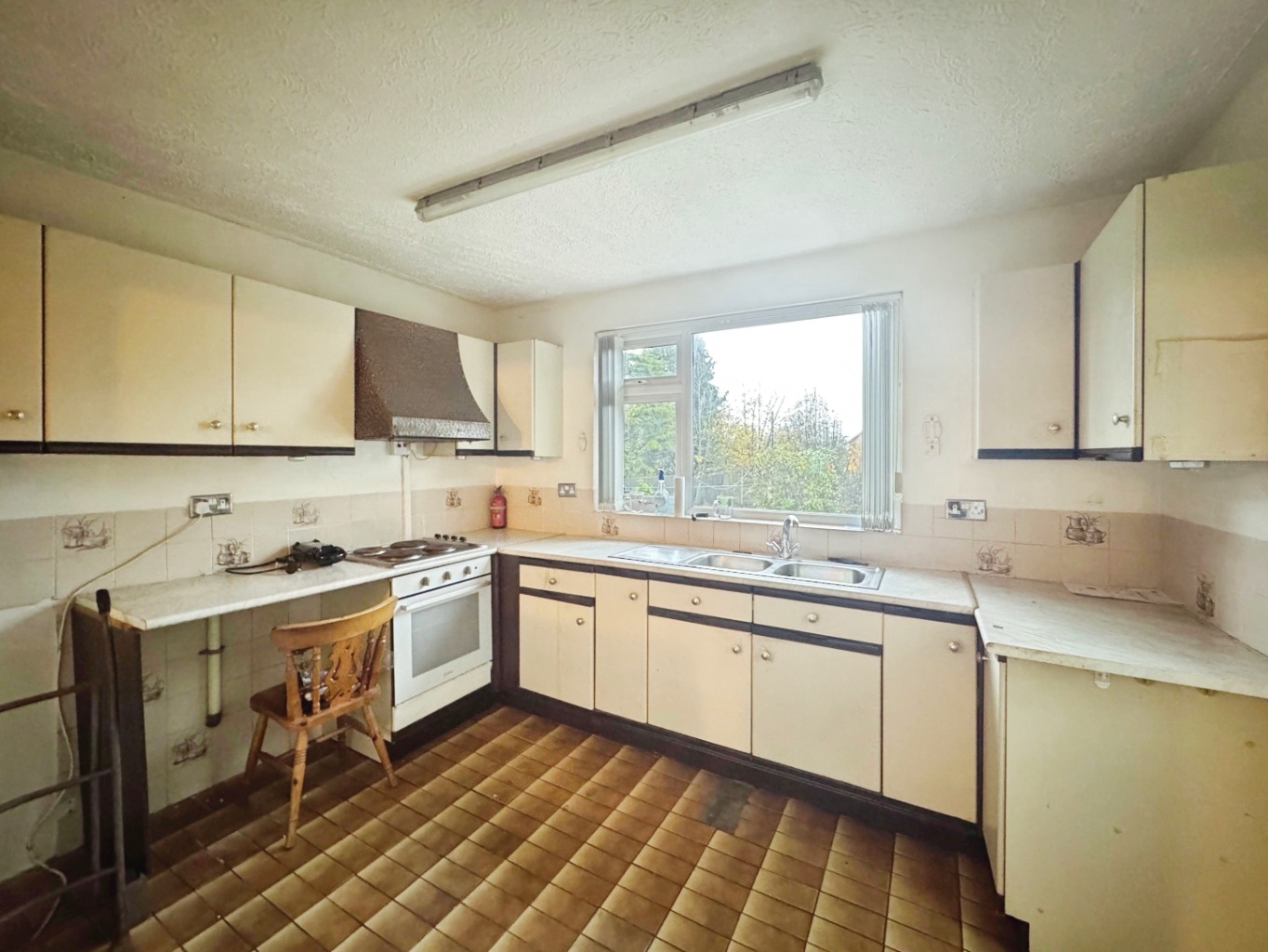 Fitted with a range of matching wall and base units with work surface over, stainless steel double sink with drainer and mixer tap, four ring hob with electric oven under and extractor fan over, plumbing for washing washing, radiator, uPVC double glazed window, obscure uPVC double glazed door, tiled floor, part tiled walls.