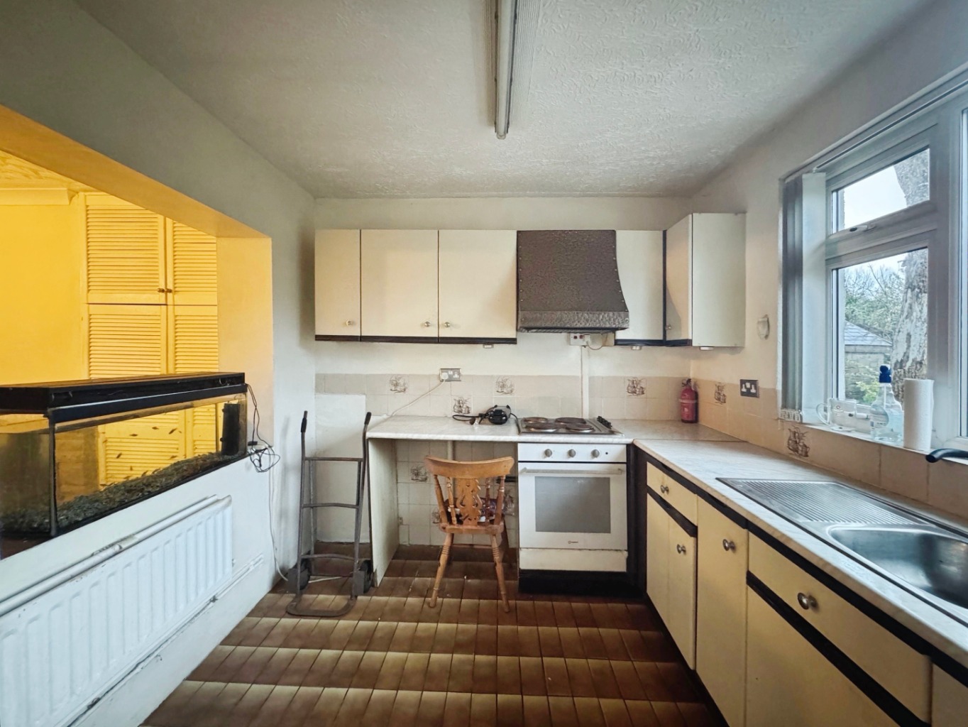 Adjacent to the living area is the kitchen/breakfast room, a practical space that holds the promise of countless delicious meals and morning coffees. While it currently awaits modernisation, envision the joy of designing a kitchen that perfectly suits your culinary adventures, a place where functionality meets your aesthetic desires. The ground floor also thoughtfully includes a four-piece bathroom suite, providing essential convenience and comfort.