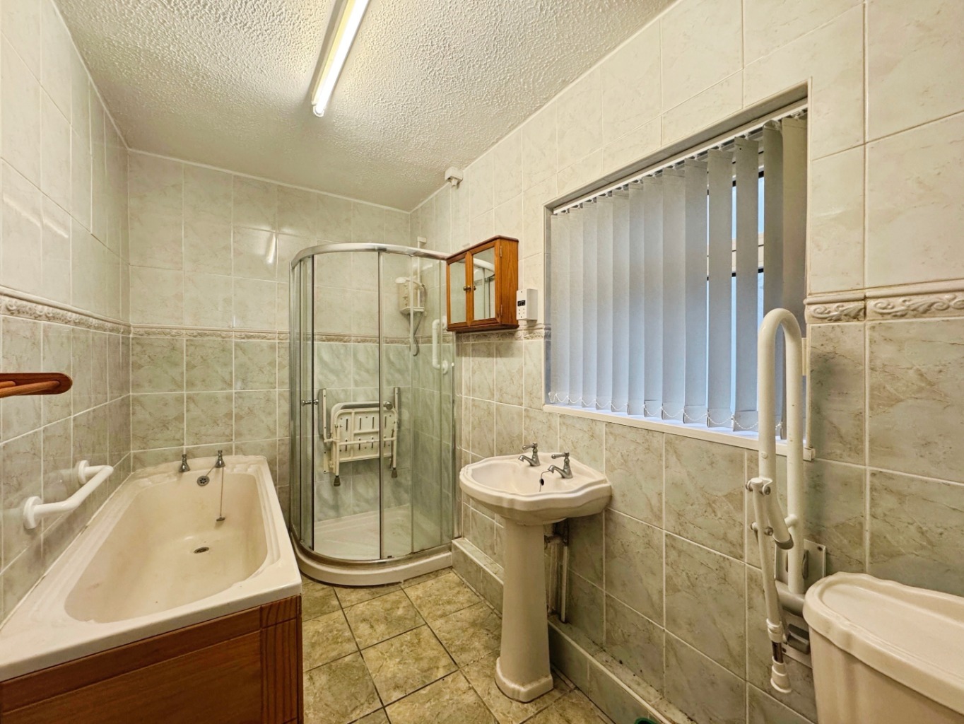 Fitted with a three piece suite comprising of bath, shower, w.c and wash hand basin, tiled floor, tiled walls, obscure uPVC double glazed window, chrome heated towel warmer.