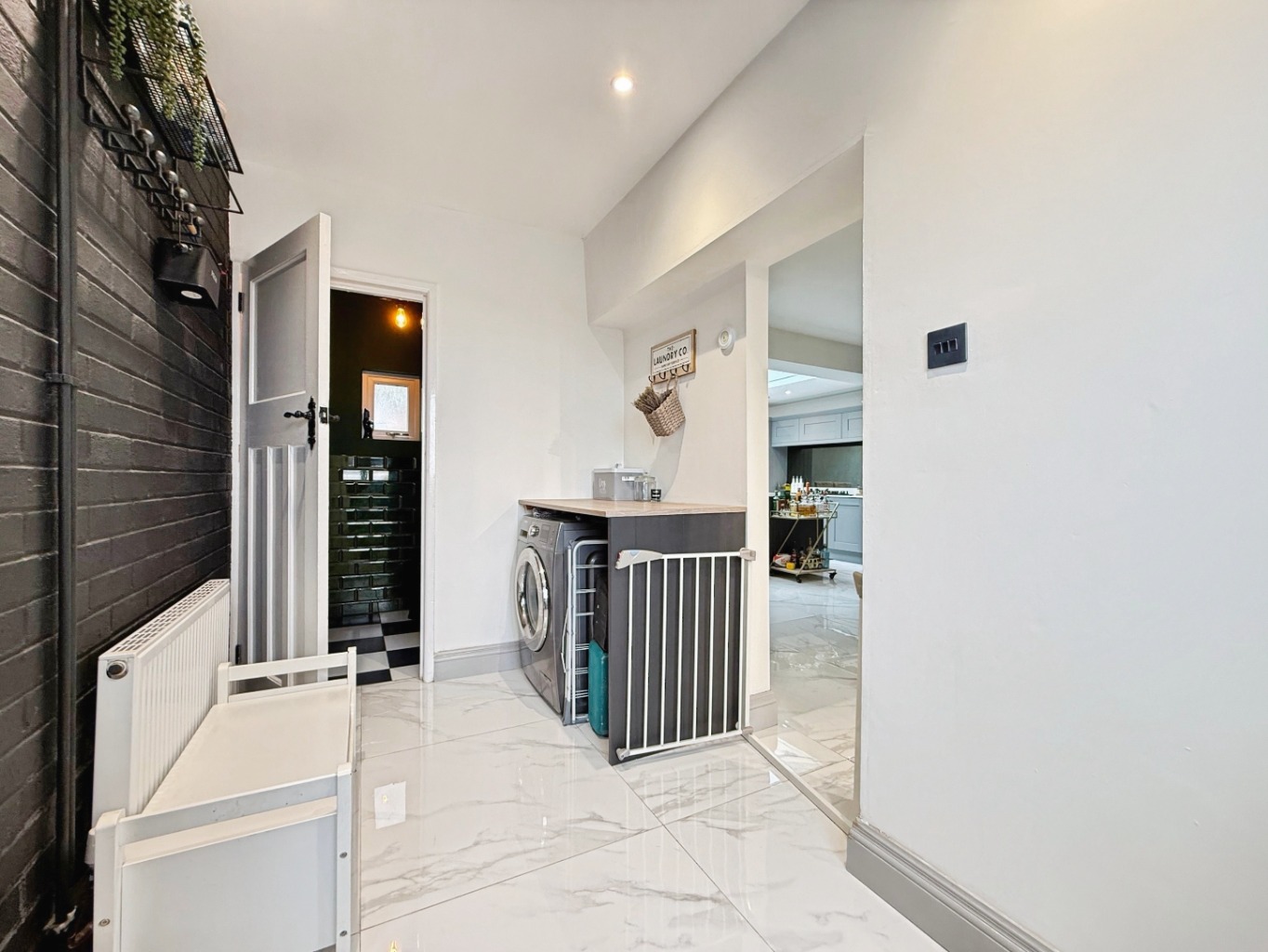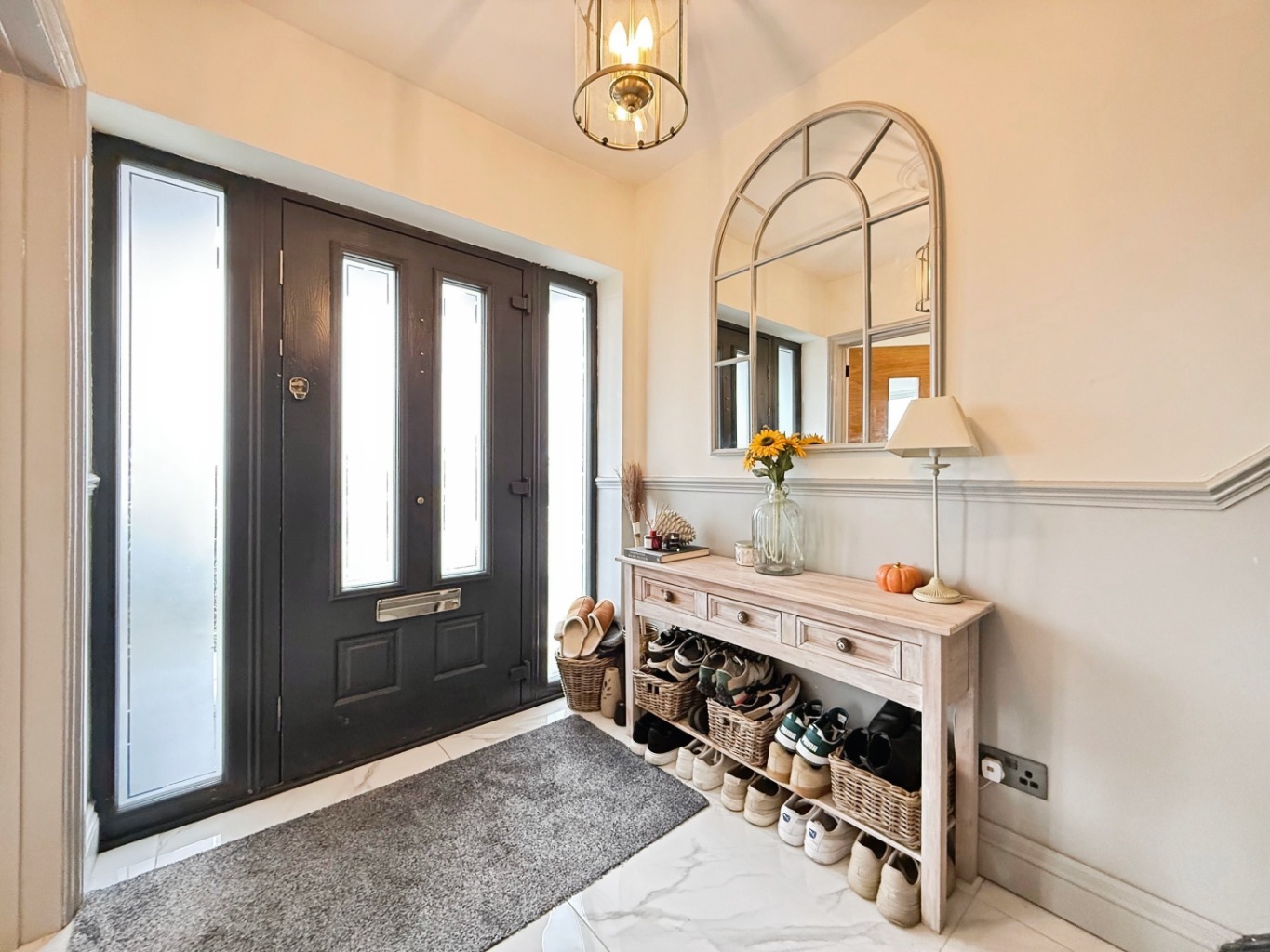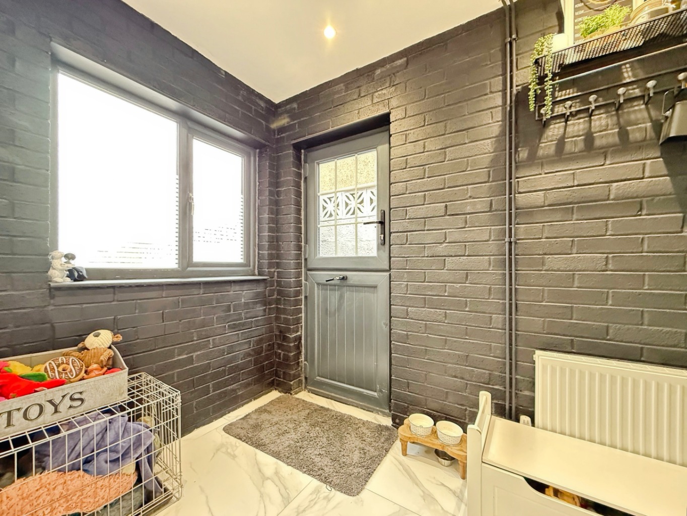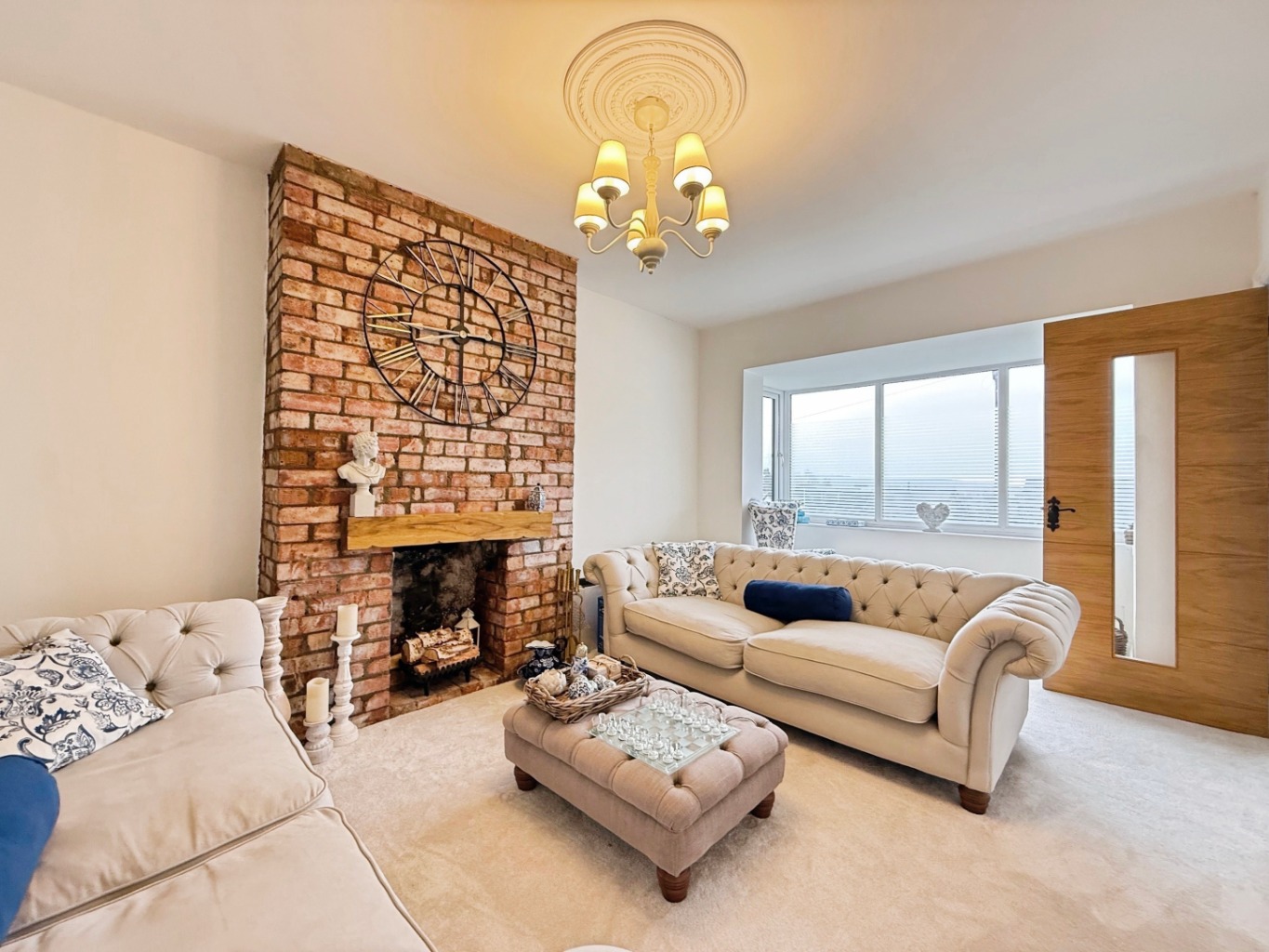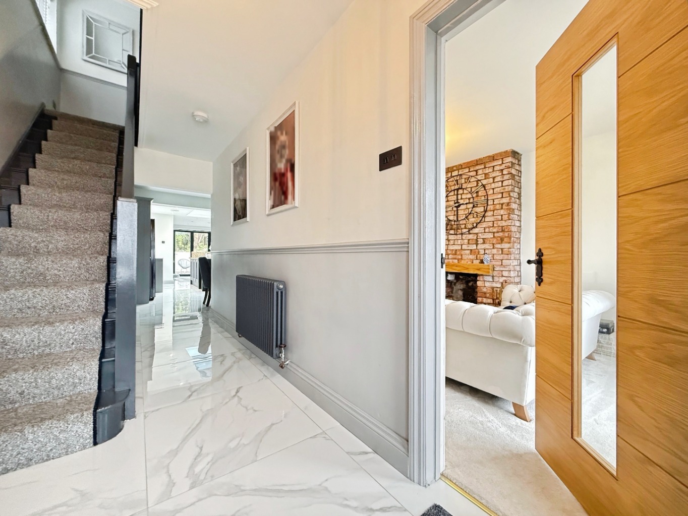 Step into a welcoming hallway with high gloss tiled flooring and modern touches that flow seamlessly throughout the home. To the front, a cosy lounge features a striking brick-built chimney breast and bay-style window, creating a warm and inviting space.