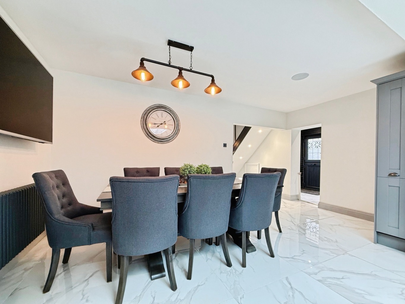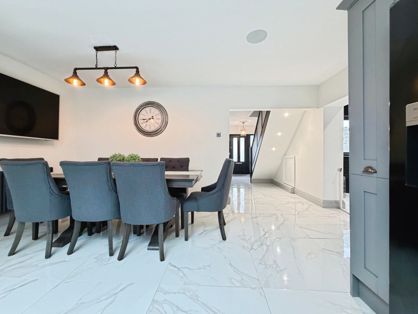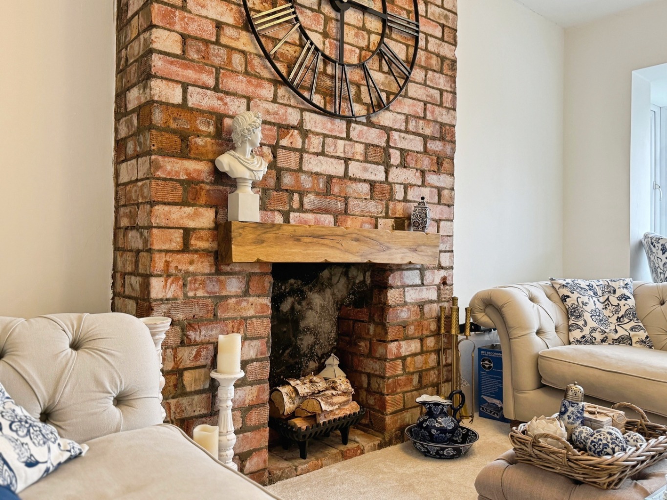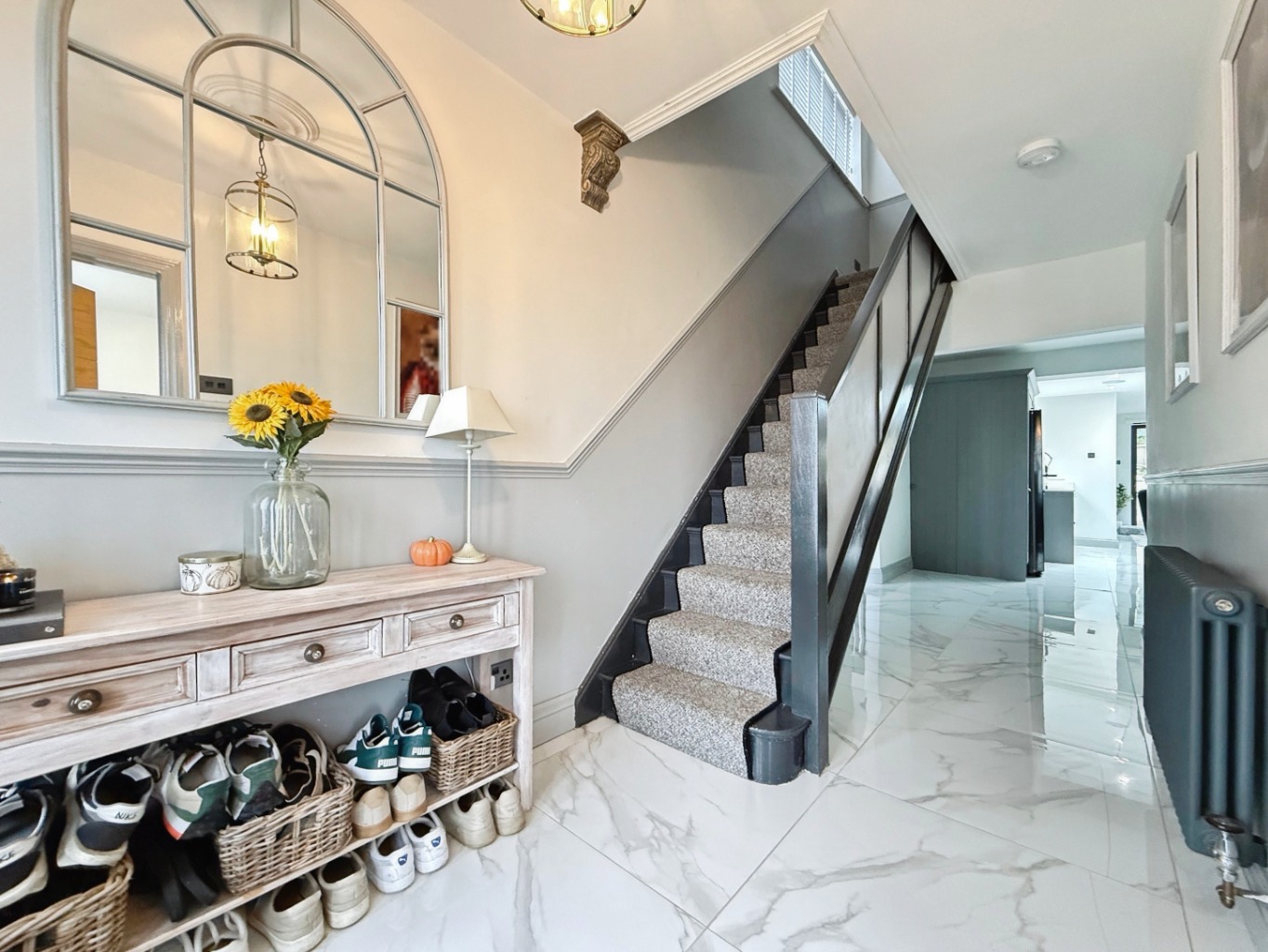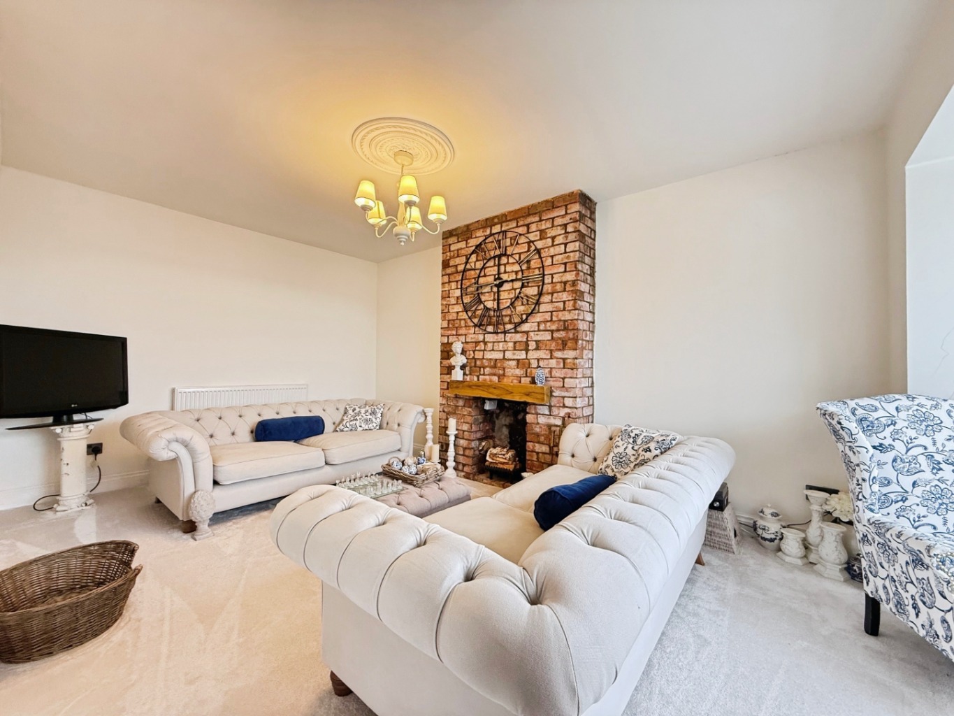 Step into a welcoming hallway with high gloss tiled flooring and modern touches that flow seamlessly throughout the home. To the front, a cosy lounge features a striking brick-built chimney breast and bay-style window, creating a warm and inviting space.