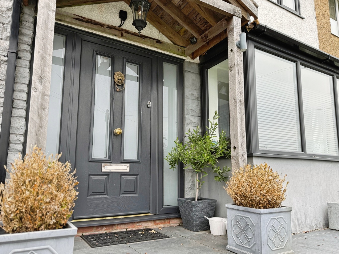From the moment you arrive, the contemporary grey windows, elegant front door, and covered outdoor porch set the tone for the stylish interior beyond.