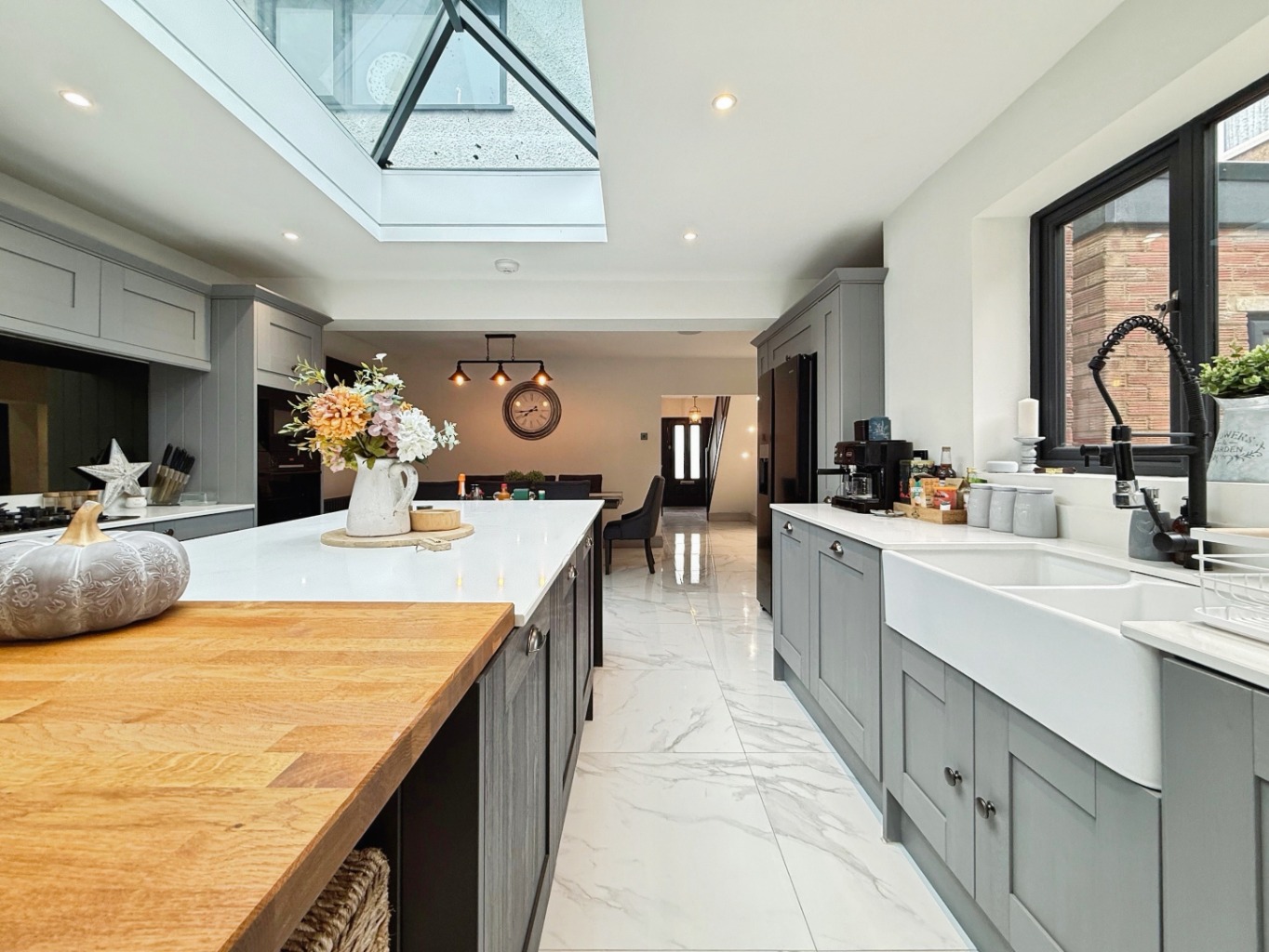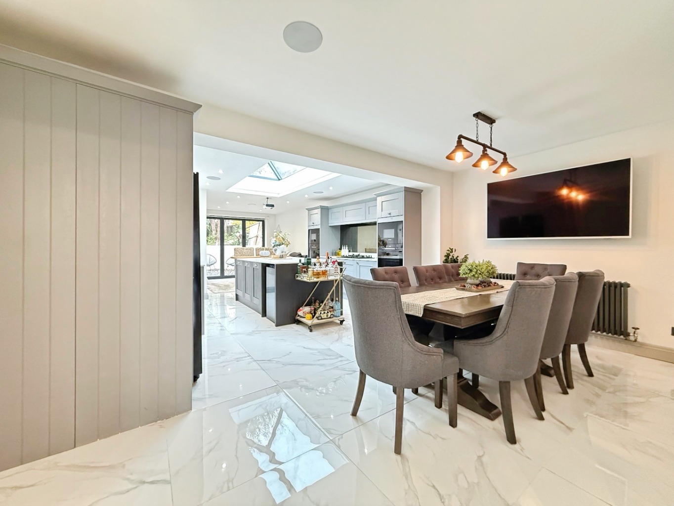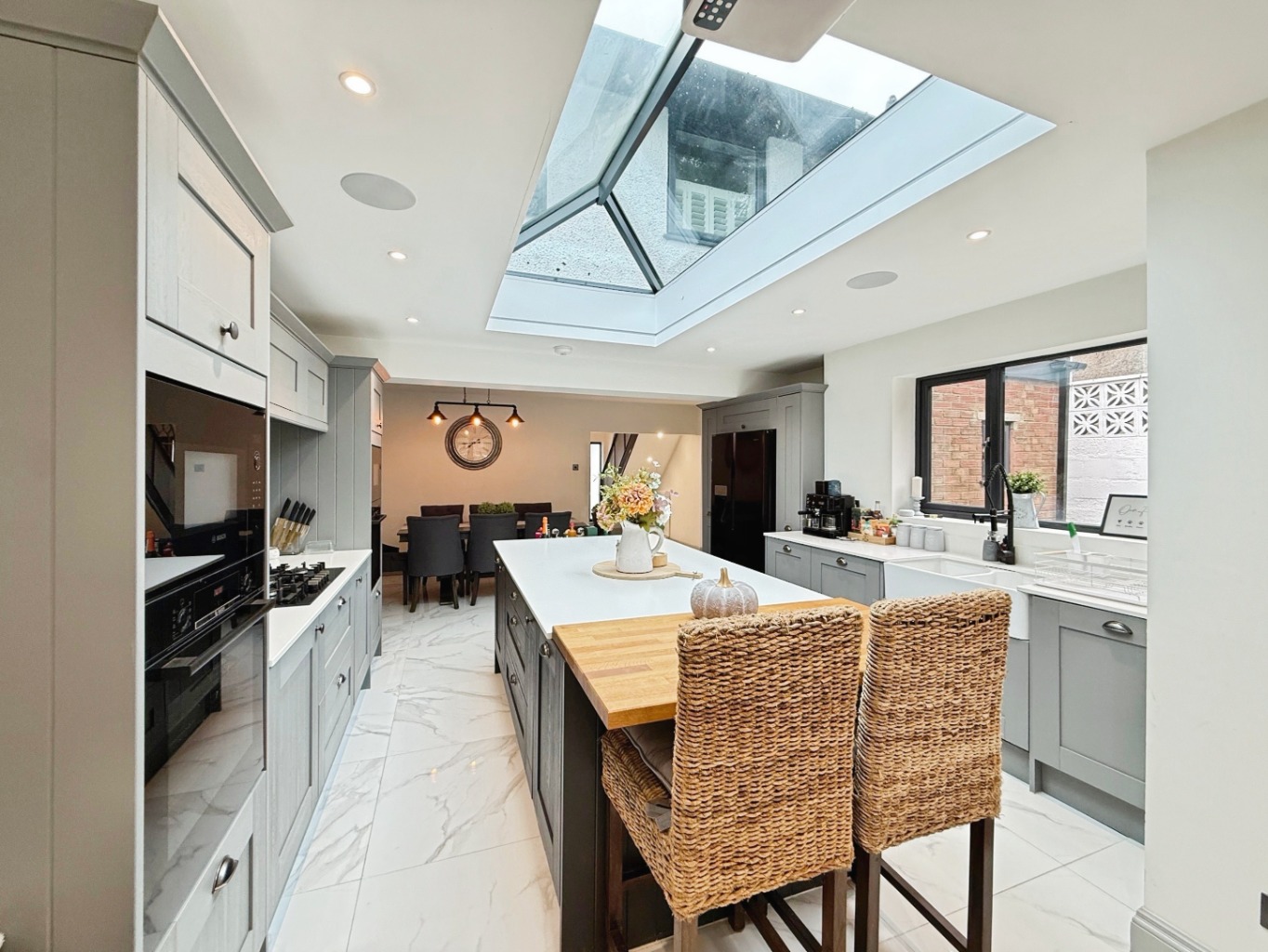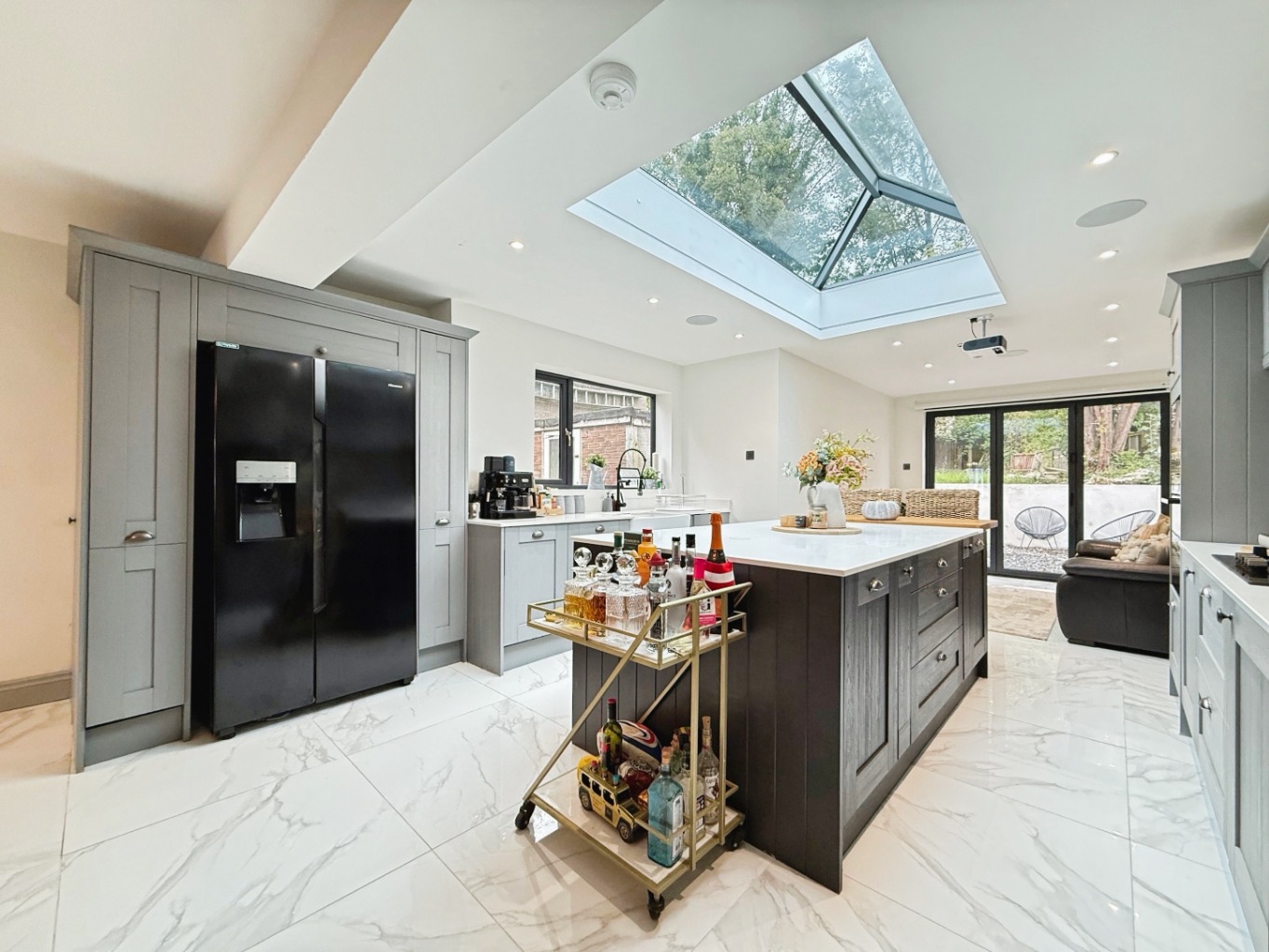 The stunning entrance leads into the elegant open-plan kitchen/dining/family room – truly the heart of the home. Designed with entertaining in mind, the space features bi-folding doors leading to the rear garden, a feature roof lantern with statement lighting, sleek spotlights, a central island with seating, and a full range of integrated appliances. A practical utility room and downstairs WC complete the ground floor.