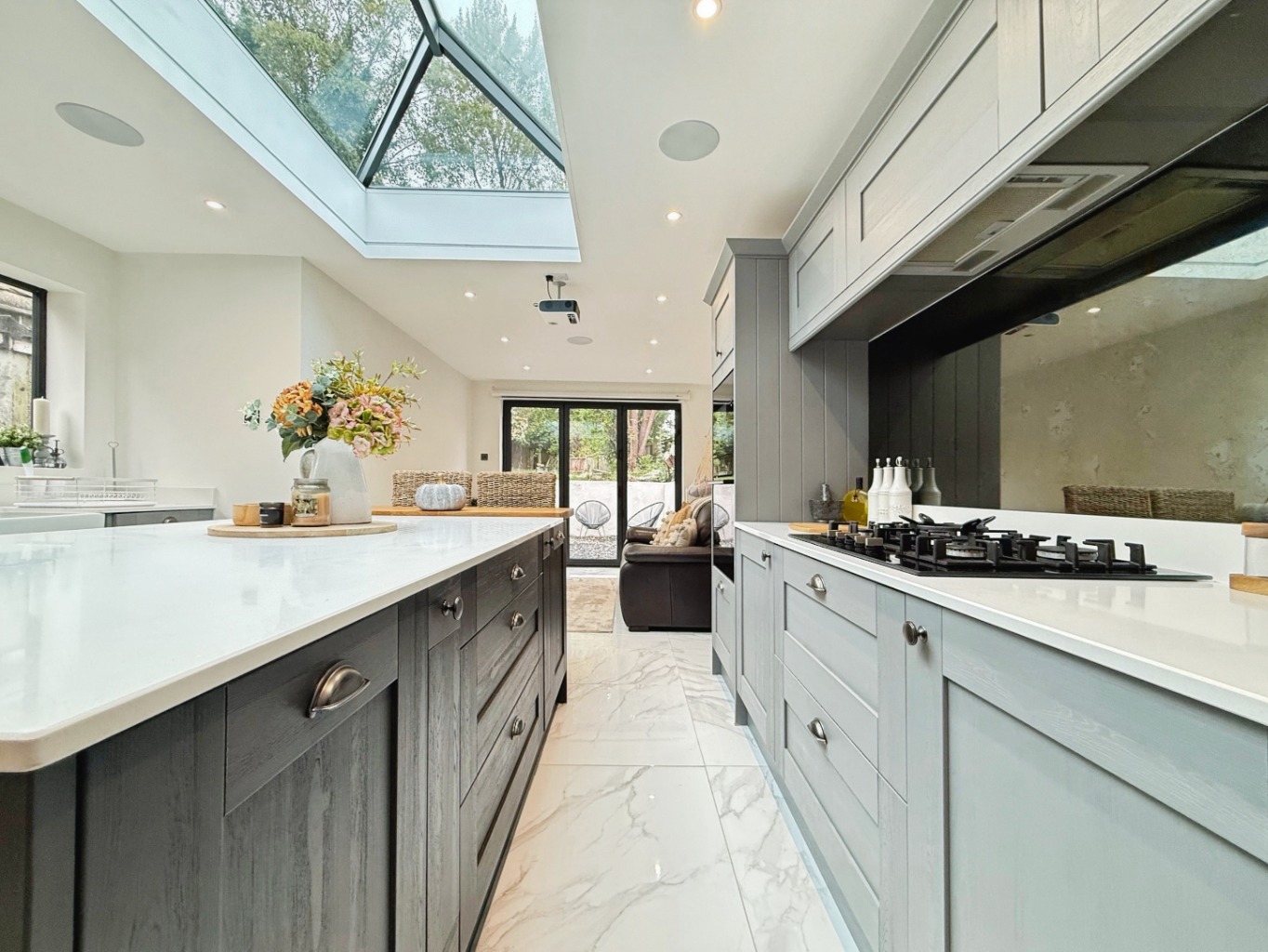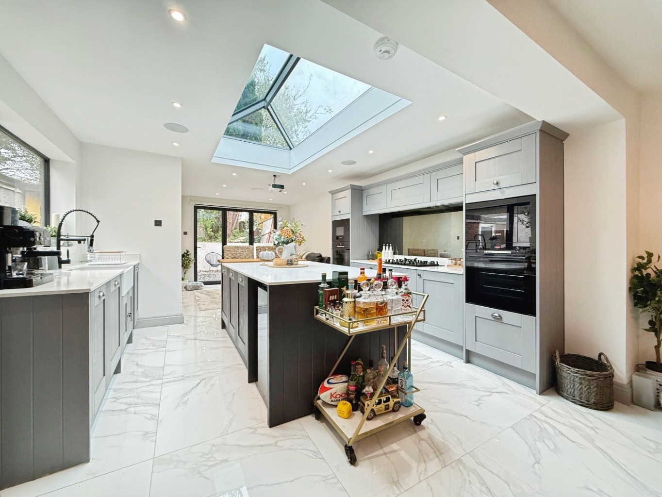 Fitted with a range of modern wall and base units in shaker two tone with complimentary quartz work surface over, Belfast sink with mixer tap, eye level integrated double oven, integrated microwave x2, five ring gas hob with extractor over, integrated dishwasher, space for American style fridge/freezer, space for wine cooler, bar stool overhang, roof lantern with feature strip lighting, 3 panel bi-folding doors, antique mirrored splashback, high gloss tiled flooring, door into: