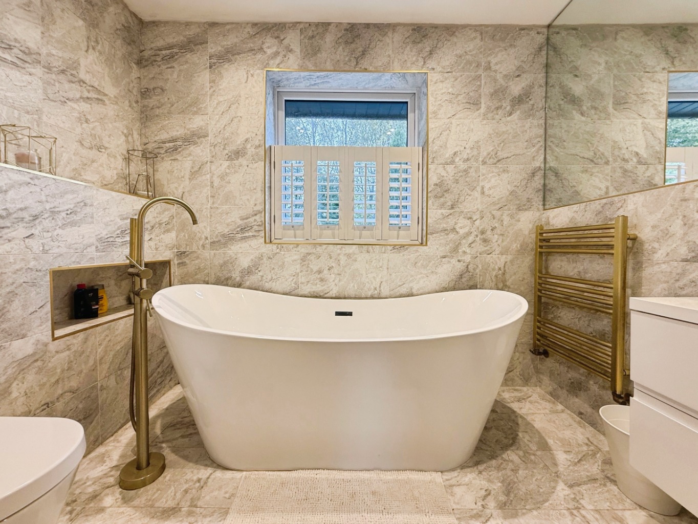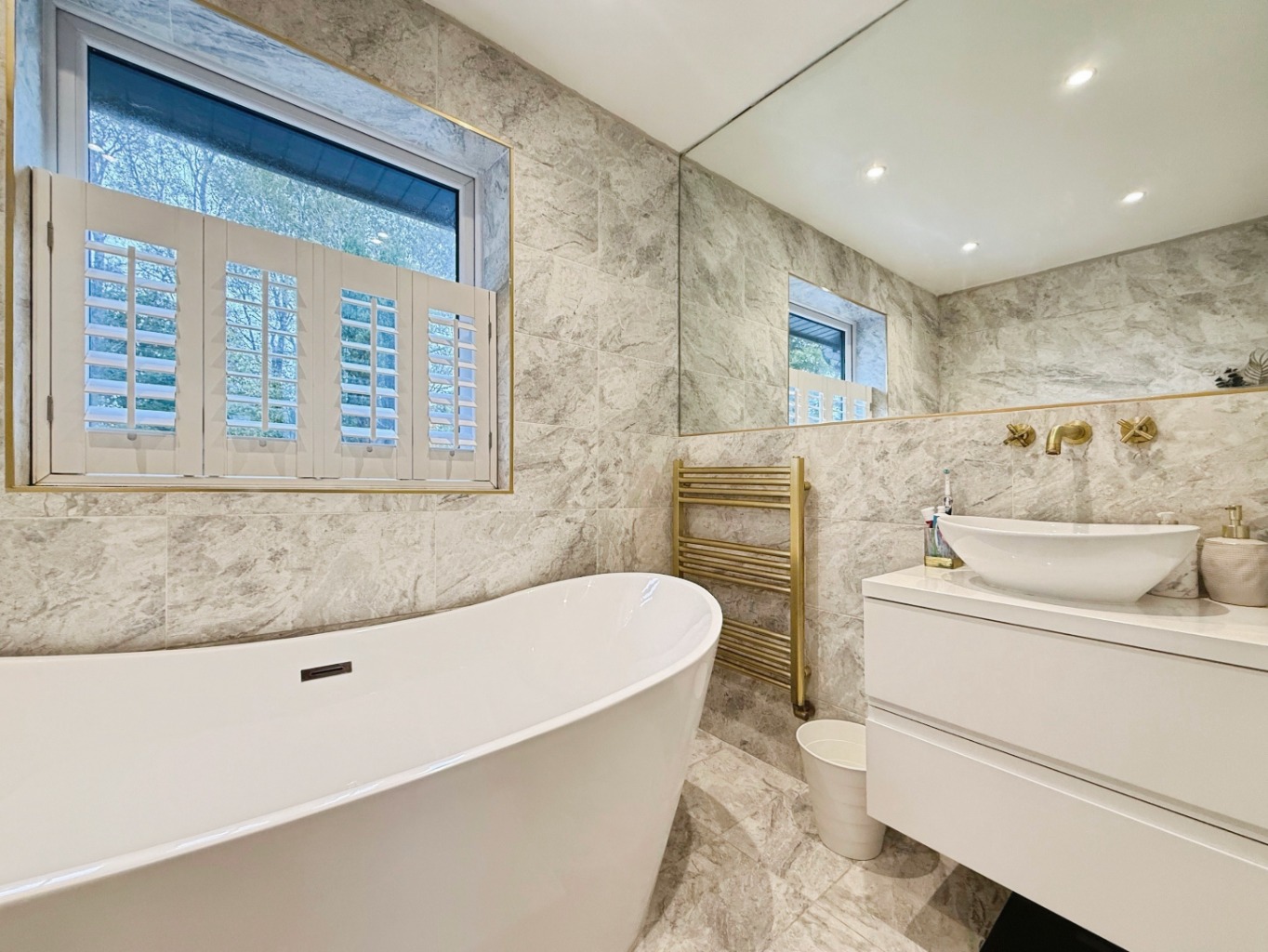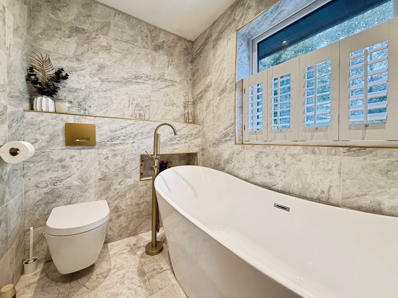 Fitted with an ultra modern three piece suite comprising of wall hung W/C with gold flush plate, freestanding bath with gold freestanding tap, gold towel rail, wall mounted vanity unit with sink and gold taps, tiled flooring and walls, uPVC double glazed window to rear elevation, spotlights to ceiling.