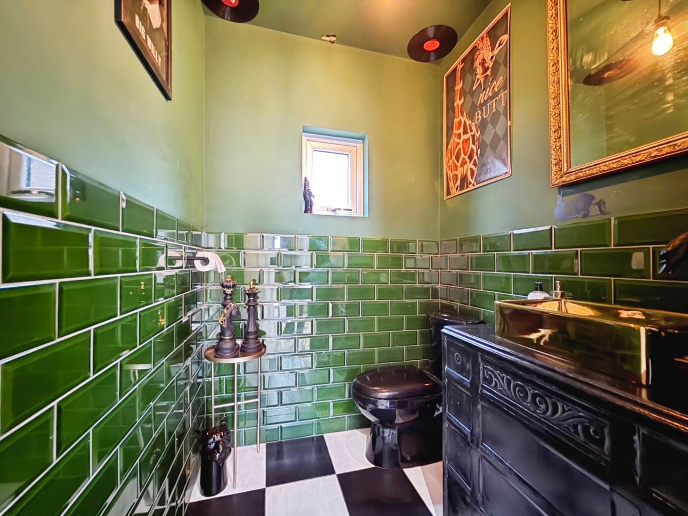 Fitted with a two piece suite comprising of black W/C and vanity unit with gold effect sink, half height tiling, tiled flooring, radiator, uPVC double glazed frosted window.