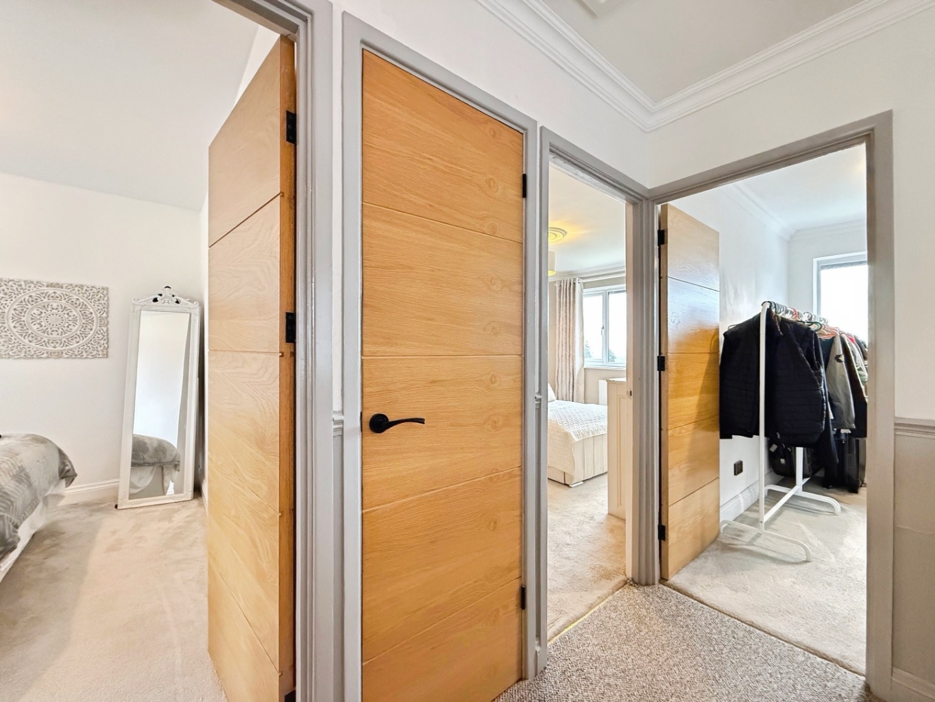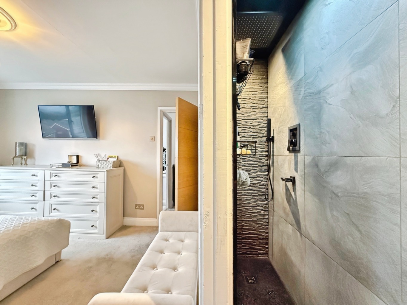 Upstairs, you’ll find three well-proportioned bedrooms, including a stylish master with its own modern en-suite shower room. The family bathroom is finished to an exceptional standard, complete with a freestanding bath, wall-hung toilet, and luxurious gold fixtures and fittings – all fully tiled for a polished look.