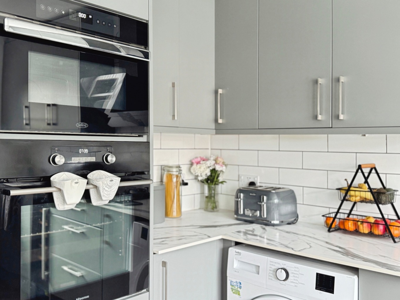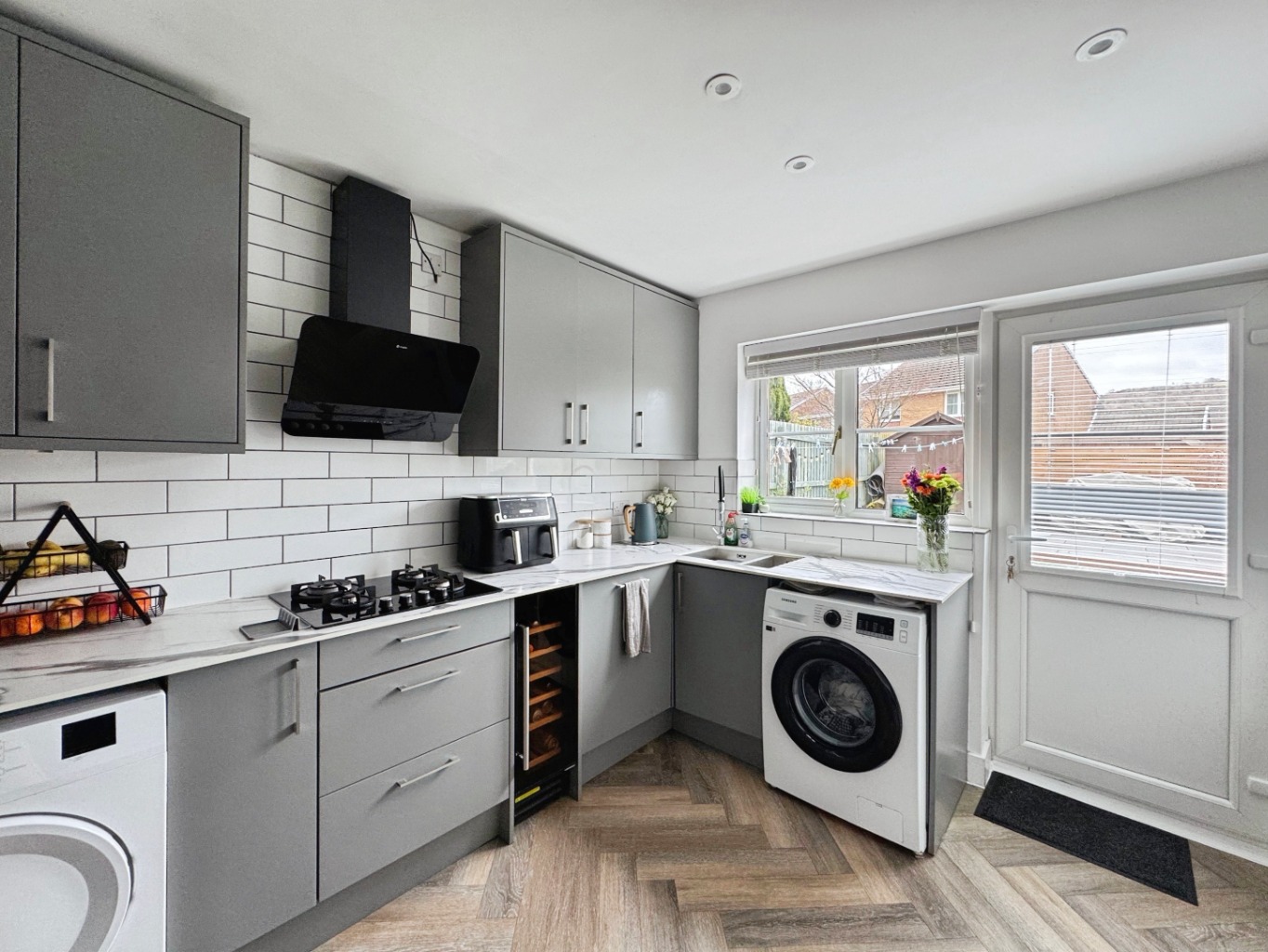 Fitted with a range of matching wall and base units with work surface over, four ring gas hob with extractor fan over and electric extractor fan over, eye level oven and microwave oven; space for American style fridge freezer, space for tumble dryer plumbing door washing machine space for wine cooler; inset 1 and 1/2 bowl sink with drainer and pull down tap, uPVC puller glazed window, obscure uPVC double glazed door, luxury vinyl flooring, designer wall mounted radiator, spotlights to ceiling.