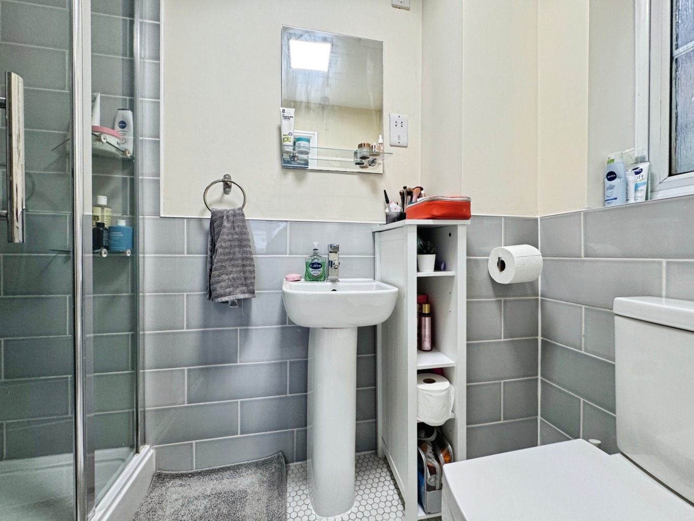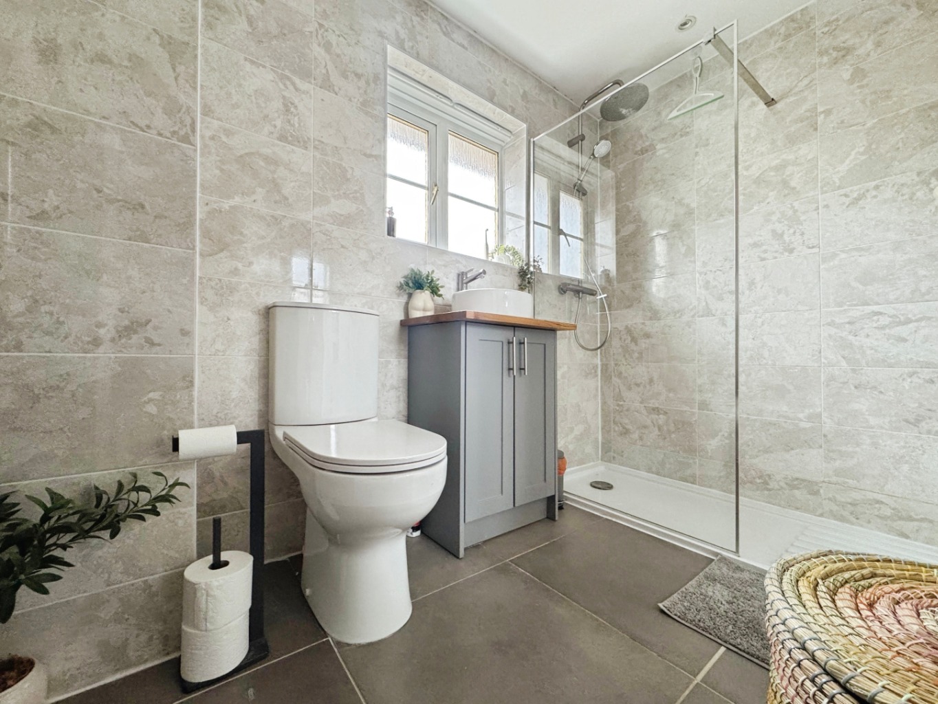 Fitted with a three piece suite comprising of rainwater shower, w.c and wash hand basin, part tiled walls, vinyl flooring, obscure uPVC double glazed window, radiator, electric shaver point.