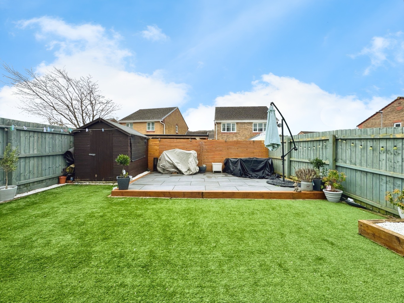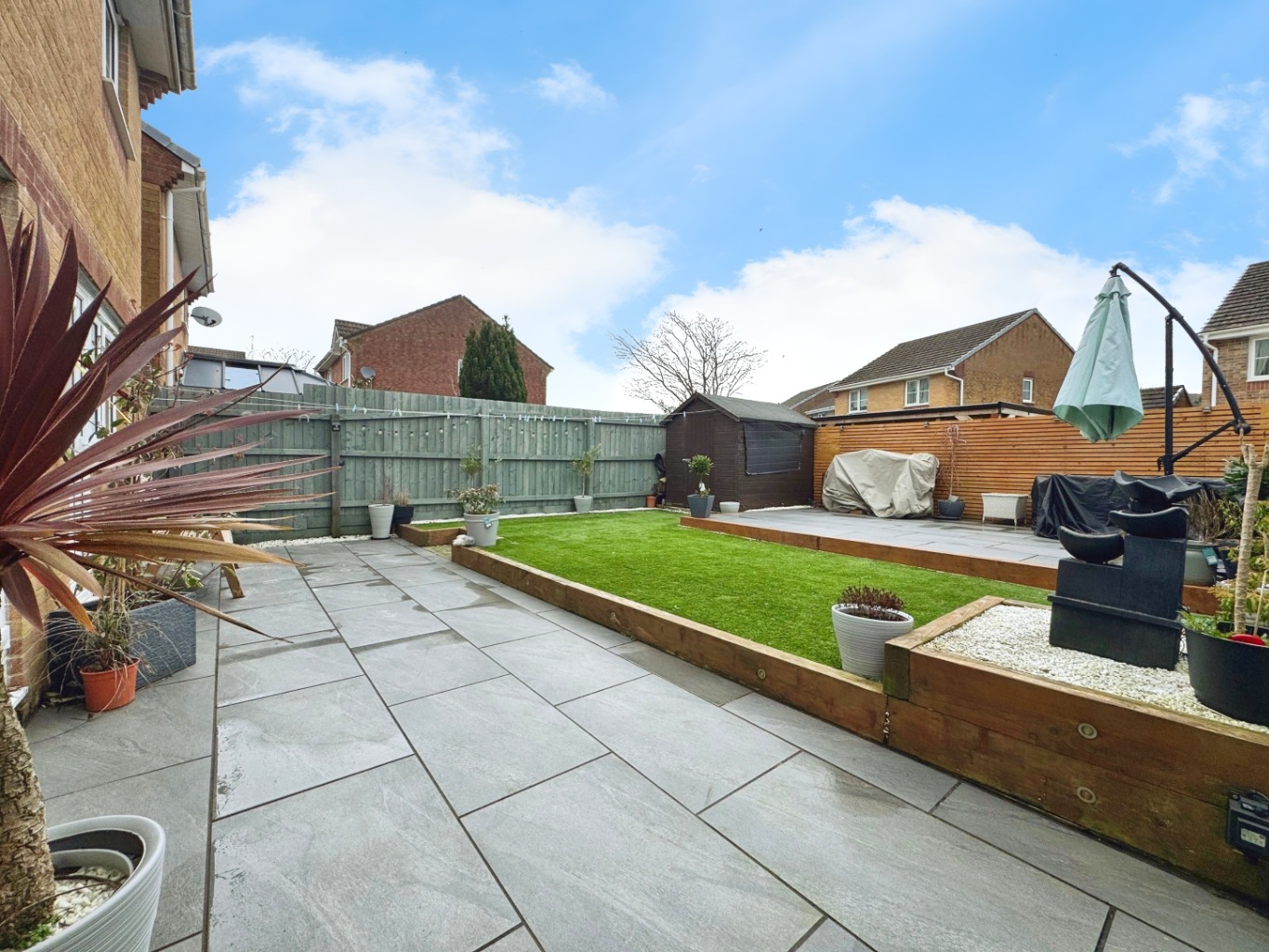 This beautiful garden has been landscaped to provide a tw paved patio areas with an artificial lawn and wooden storage shed plus outdoor lighting and a double driveway to front.