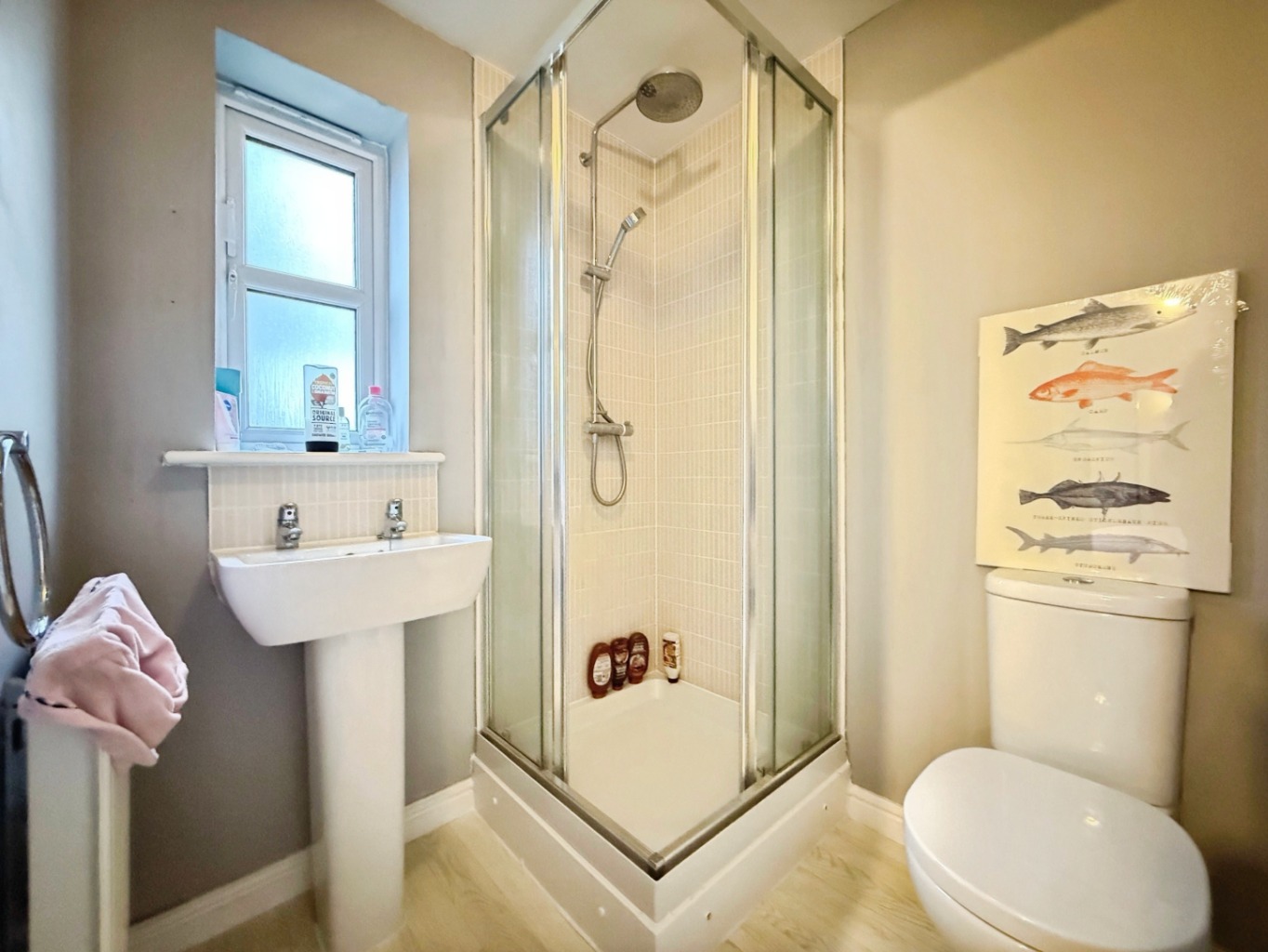 Fitted with a white three piece suite comprising of W/C, pedestal wash hand basin, corner shower cubicle, radiator, extractor fan, uPVC double glazed frosted window to front elevation.