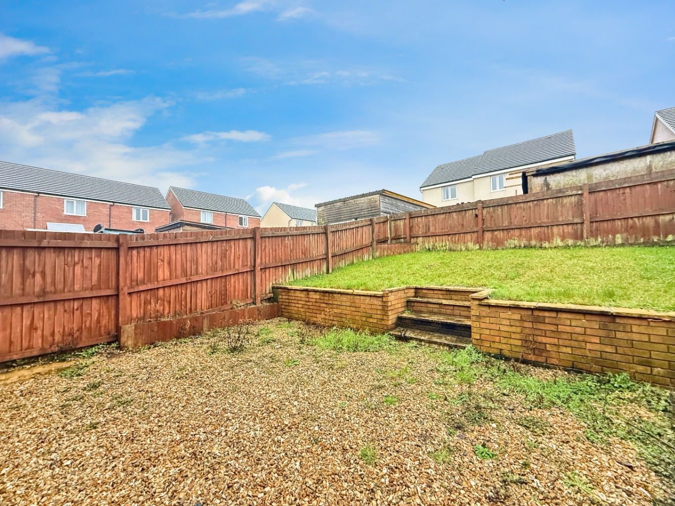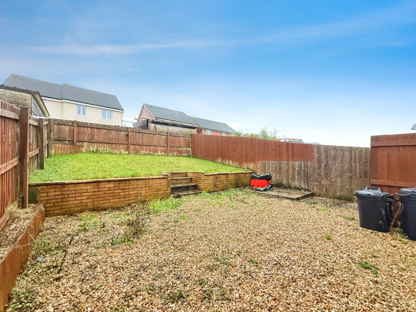 To the front of the property there is a lawn area with side driveway with space for up to 3 vehicles. Gated side access to low maintenance rear garden comprising of decorative stone area and tiered lawn space.