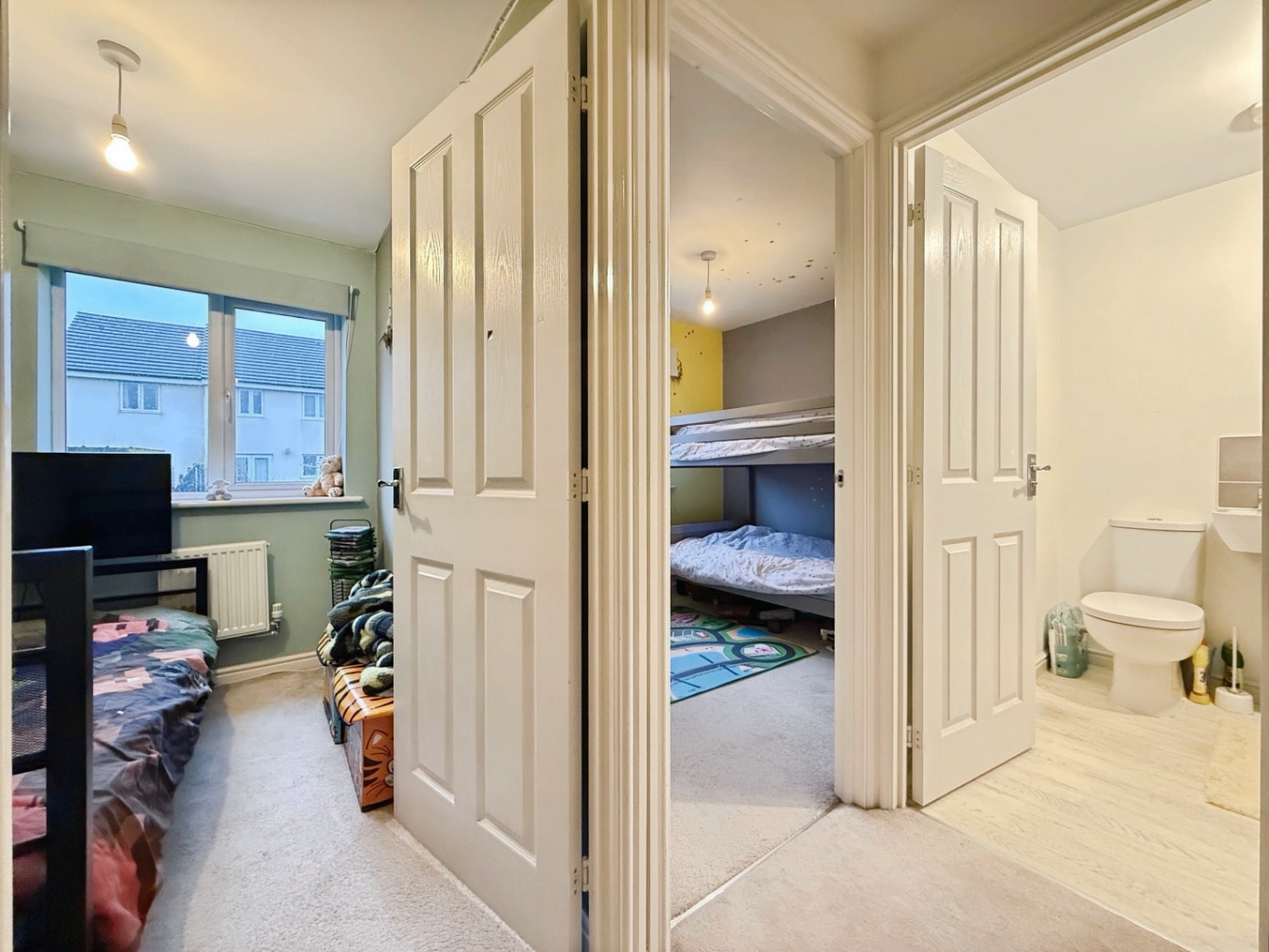 Carpeted underfoot, access to loft, airing cupboard, doors into: